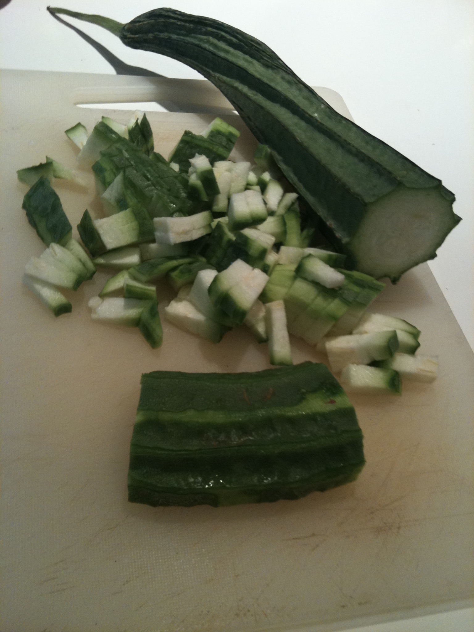 2. Chop the de-ridged gourd into cubes. Finely mince half of a small onion, and half an inch of ginger. If you like your food fiery, find a green chili or two (leave them whole so they are readily identified and avoided by the wimps in your family).