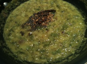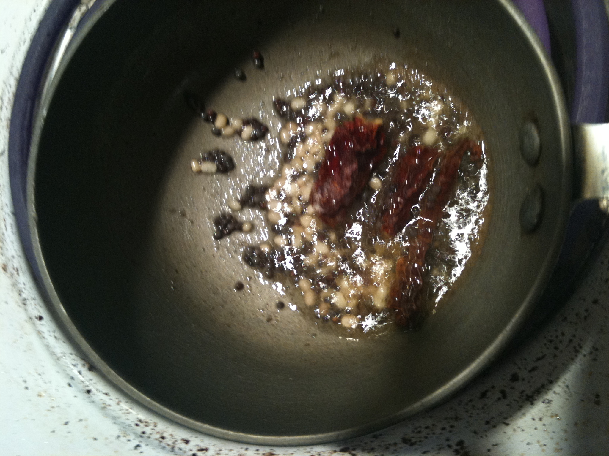 6. The last step is to “temper” the dish. This is an essential step in southern Indian cooking. To a scant tsp of oil in a small, thick bottomed pan (we actually used large iron ladles for this), add a tsp of white urad dal, a tsp of black mustard seeds, one dry red chili broken into large bits and a sprinkling of asafoetida.