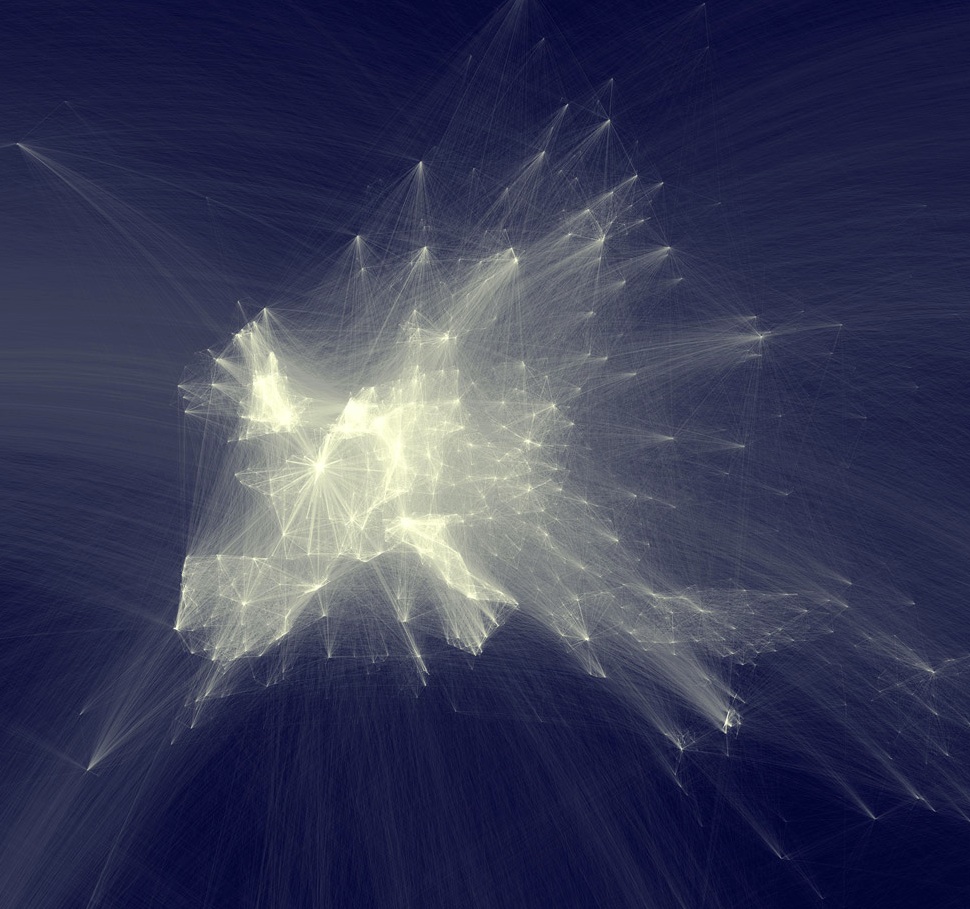Globalization of Science! Inspired by the friendship map of Facebook, this visually gorgeous map documents collaborations between scientists from bibliographic information in databases. Each paper published with authors from different cities is one line with geographical coordinates mapped onto a Mercator projection. Definitely check out zoomable link below!