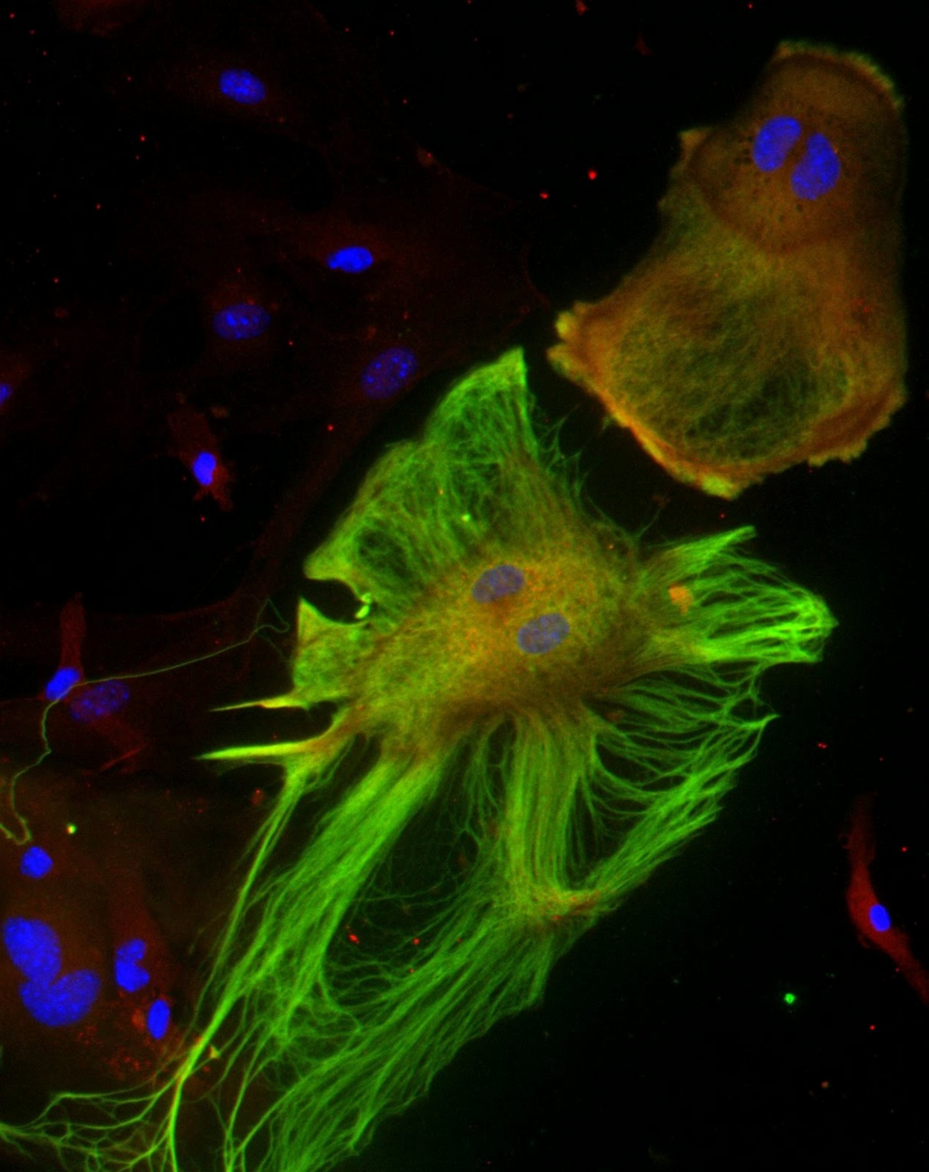 Boo! : Mouse astrocytes stained for GFAP isoforms (red and green) with sad nuclei ‘eyes’ in blue.