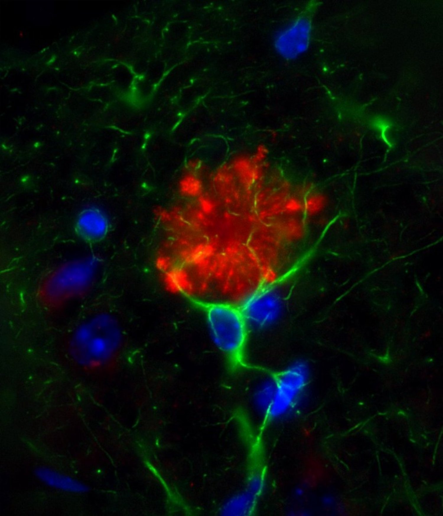 A Rose : Astrocyte cell stained green for GFAP wrapping its arms around a plaque of amyloid precursor protein (red) in the brain of an Alzheimer mouse. Nuclei in blue.