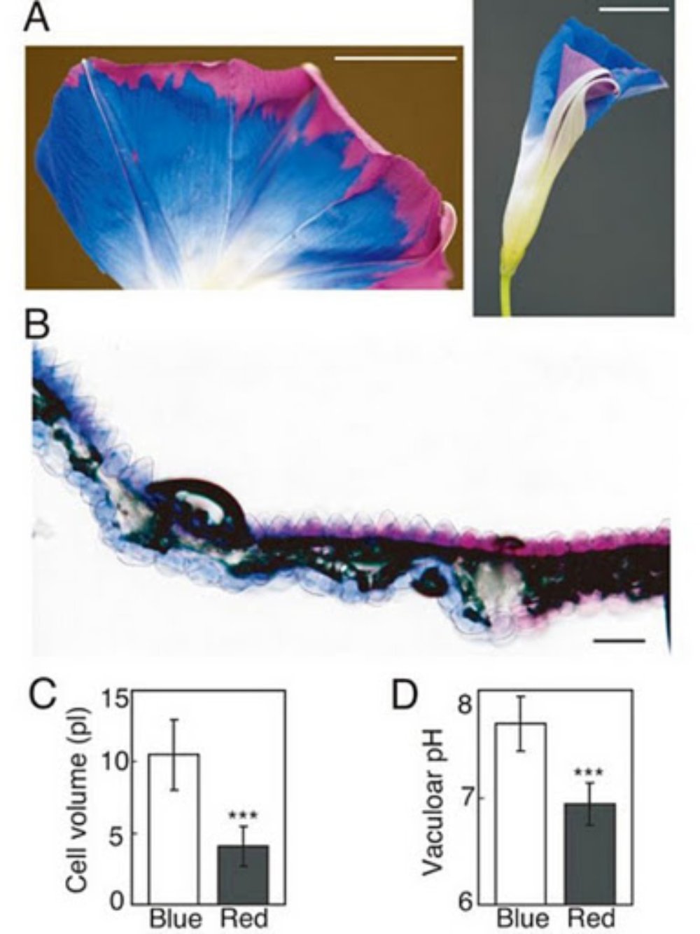 A section of the petal (B) shows the transition in color. Notice the change in cell volume (C) and pH (D) accompanying the color change. This is a caused by the induction of a gene, NHX1 that exchanges sodium or potassium ions for protons and regulates lumen pH. This gene was discovered serendipitously in my lab back in the ’90’s.