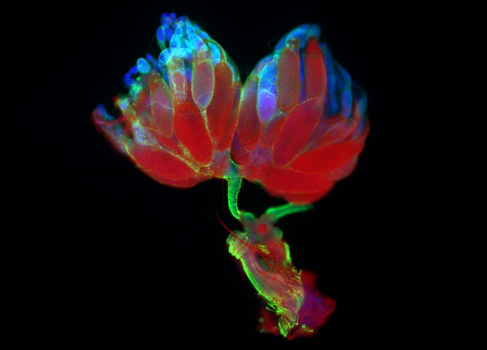 This is an image of the ovaries and oviducts of the fruit fly Drosophila melanogaster. It is one of the best systems for studying basic stem cell biology. Each ovary has 12-16 ovarioles. Stem cells are located in a niche, the most apical part, known as germarium. There are three types of stem cells: germline stem cells (GSCs), somatic stem cells (SSCs) and newly identified escort stem cells (ESCs), whose activities have been confirmed by lineage tracing and laser ablation experiments.
