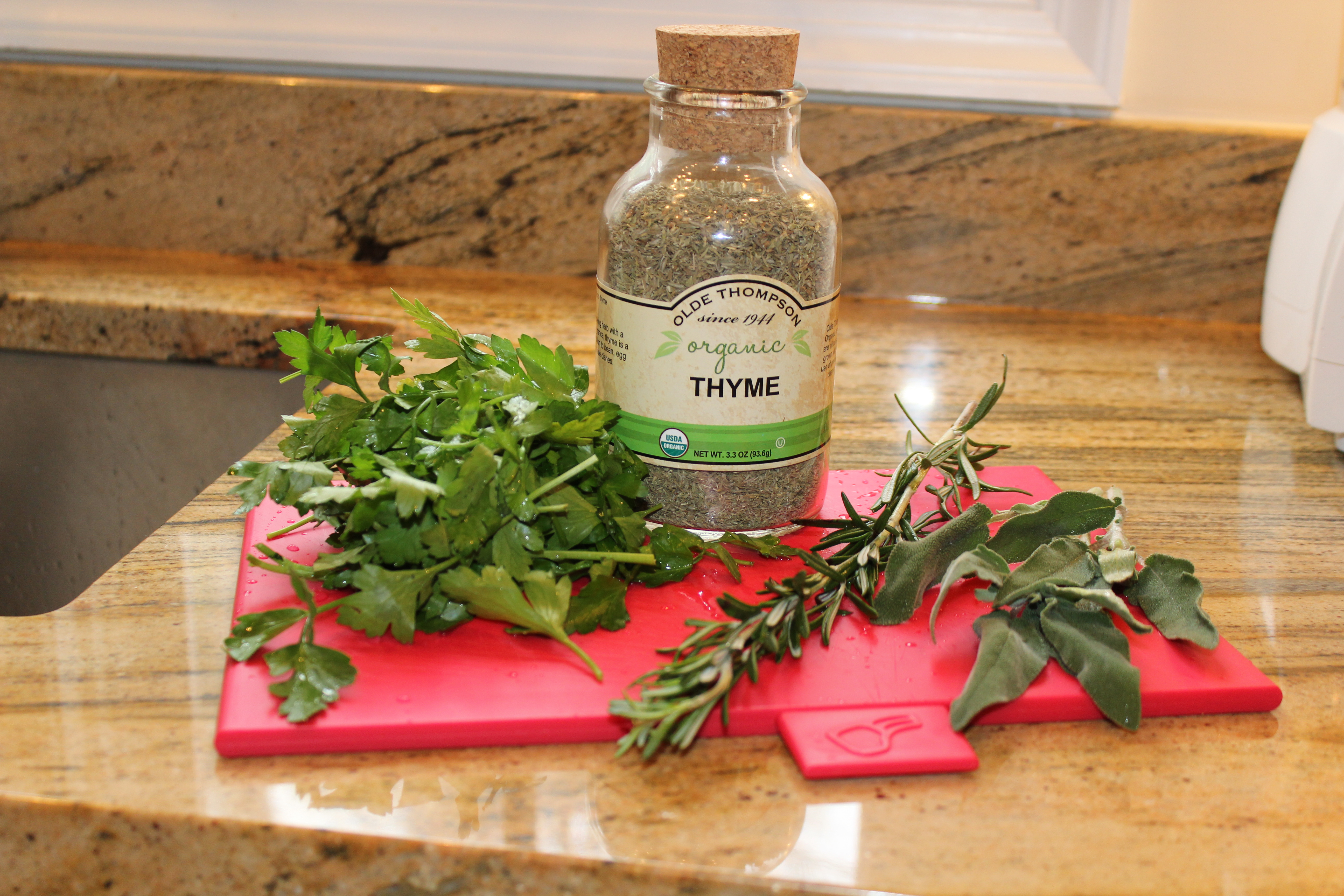 Clockwise: parsley, sundried tomatoes in oil, rosemary, garlic cloves, dry thyme.