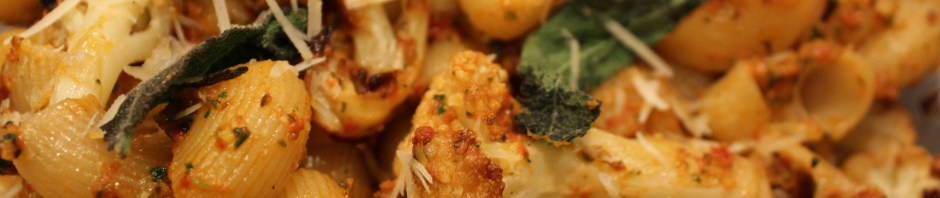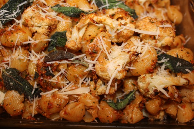 • Gently fold in cauliflower florets. Top with more grated parmesan and decorate with fried sage leaves. Did I forget to mention that last step? They sort of tended to explode in the hot oil (I used a bare tablespoon of olive oil), so I may not have done it right. They did change aroma and become more sage-y, so that was good.