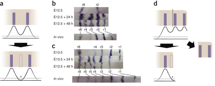 To understand, look at Image 3: As the tissue expands,levels of the inhibitor diffusing from the stripes fall below a threshold (dashed line) so that the activator now gets back to work and produces a new stripe (dashed bar). The other panels show real data from the Nature Gen paper. Notice the appearance of the new stripe r3, first between r8 and r2 and then another (r4) between r8 and r3 both in the excised tissue and in the animal (in vivo). If diffusion of the inhibitor is blocked by making a cut next to the stripe, a new stripe emerges.