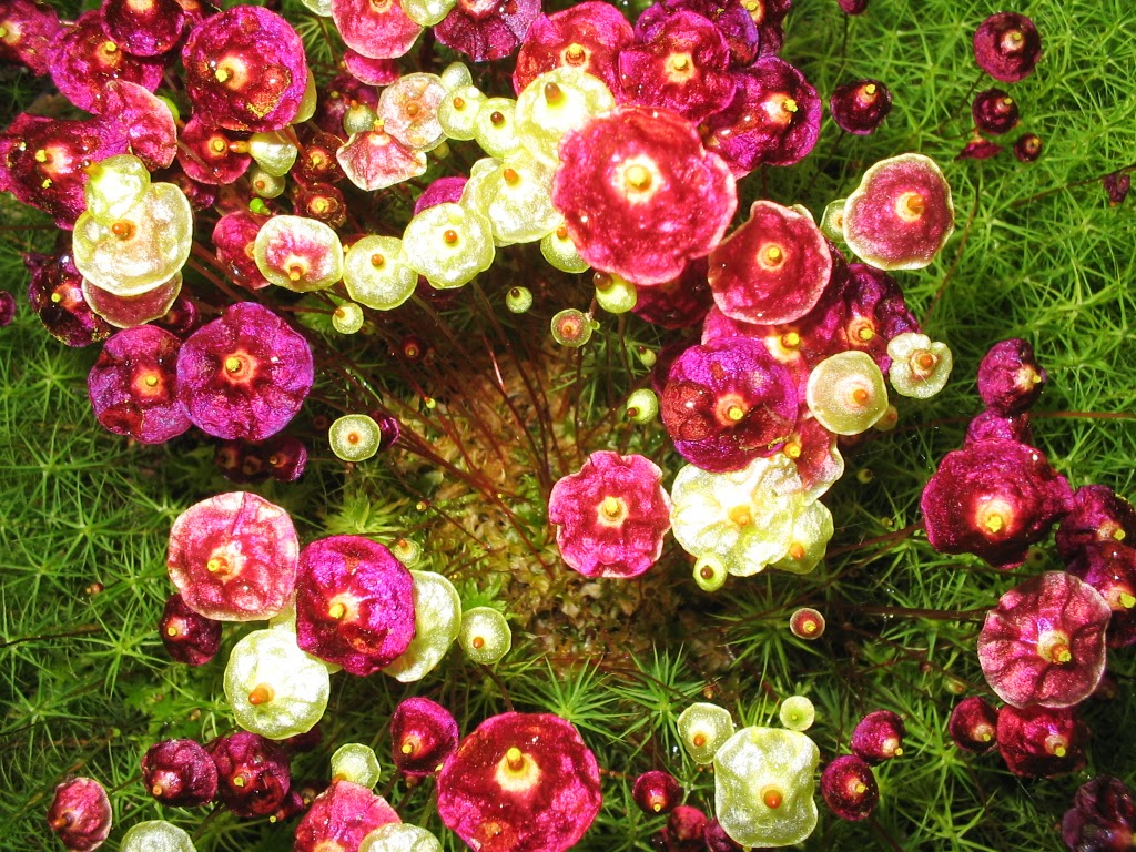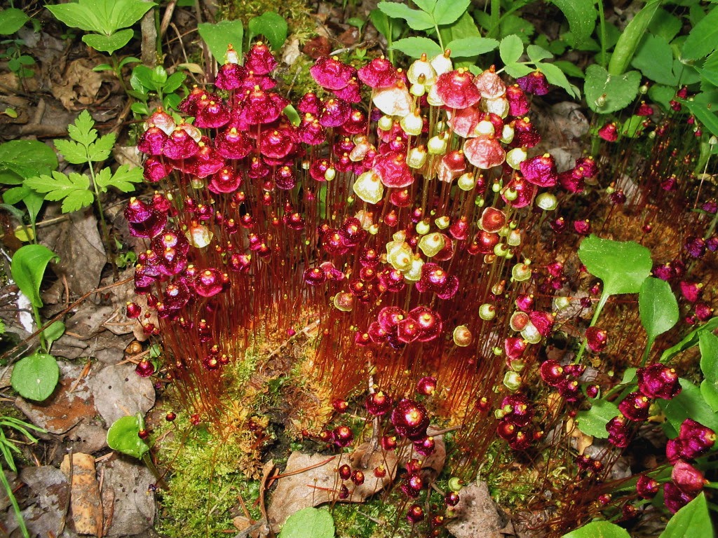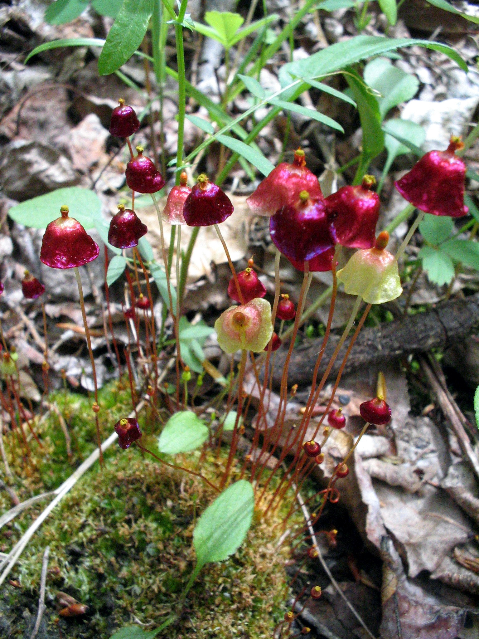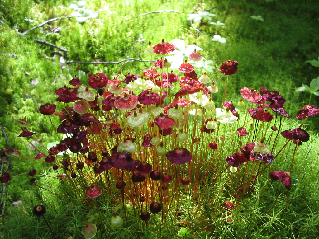Fairy Parasols is the common name for Splachnum rubrum. Those aren’t flowers in the photos (a bouquet for Rajini Rao) but the fruiting bodies of a bryophyte. The photos may actually show two species–the pale, green Sphlachnum luteum and the pomegranate red Splachnum rubrum. However, the former ‘usually’ grows on moose droppings while the latter grows only on owl pellets. Imagine that. So, it would be odd to have both species in the same microsite.