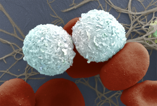 SEM pictures look misleadingly like photographs. Can you describe in one sentence or two what we are seeing? My guess is that the blood is dried and coated in gold, distance from a scanning plane is measured in each point and a 3D image is generated with artificial colors and lighting.