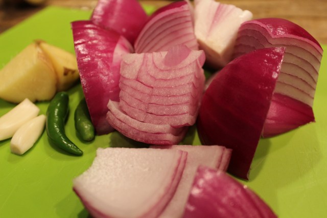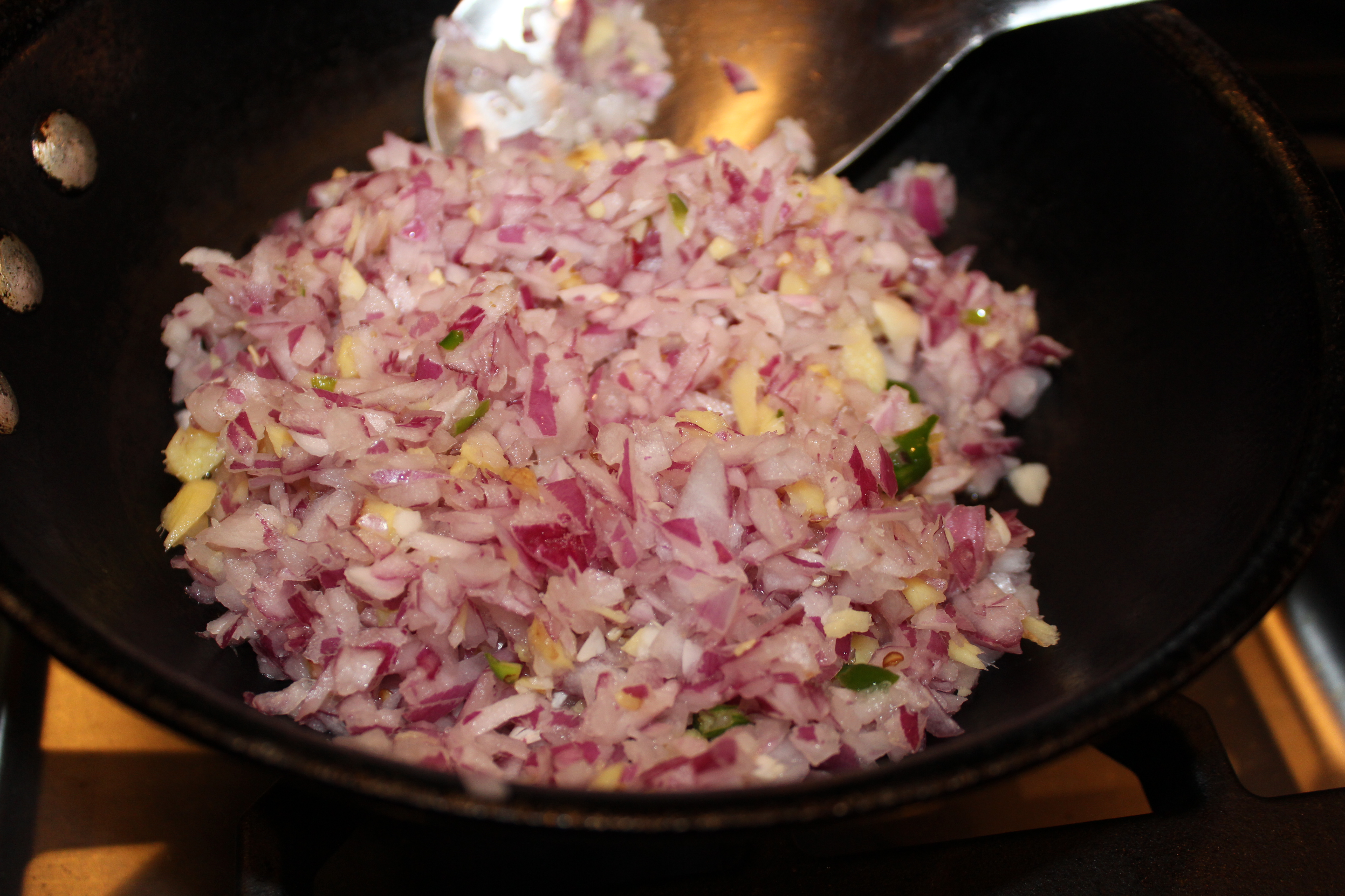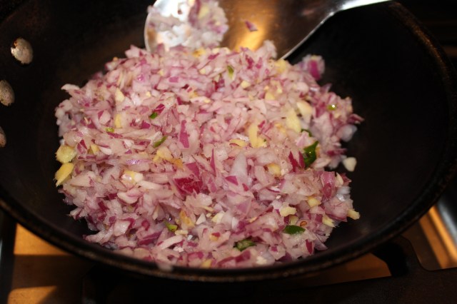 • Next, add the aromatics: onions, garlic, ginger and green chillies (more or less to taste). Chop finely by hand or using a few pulses on a food processor.