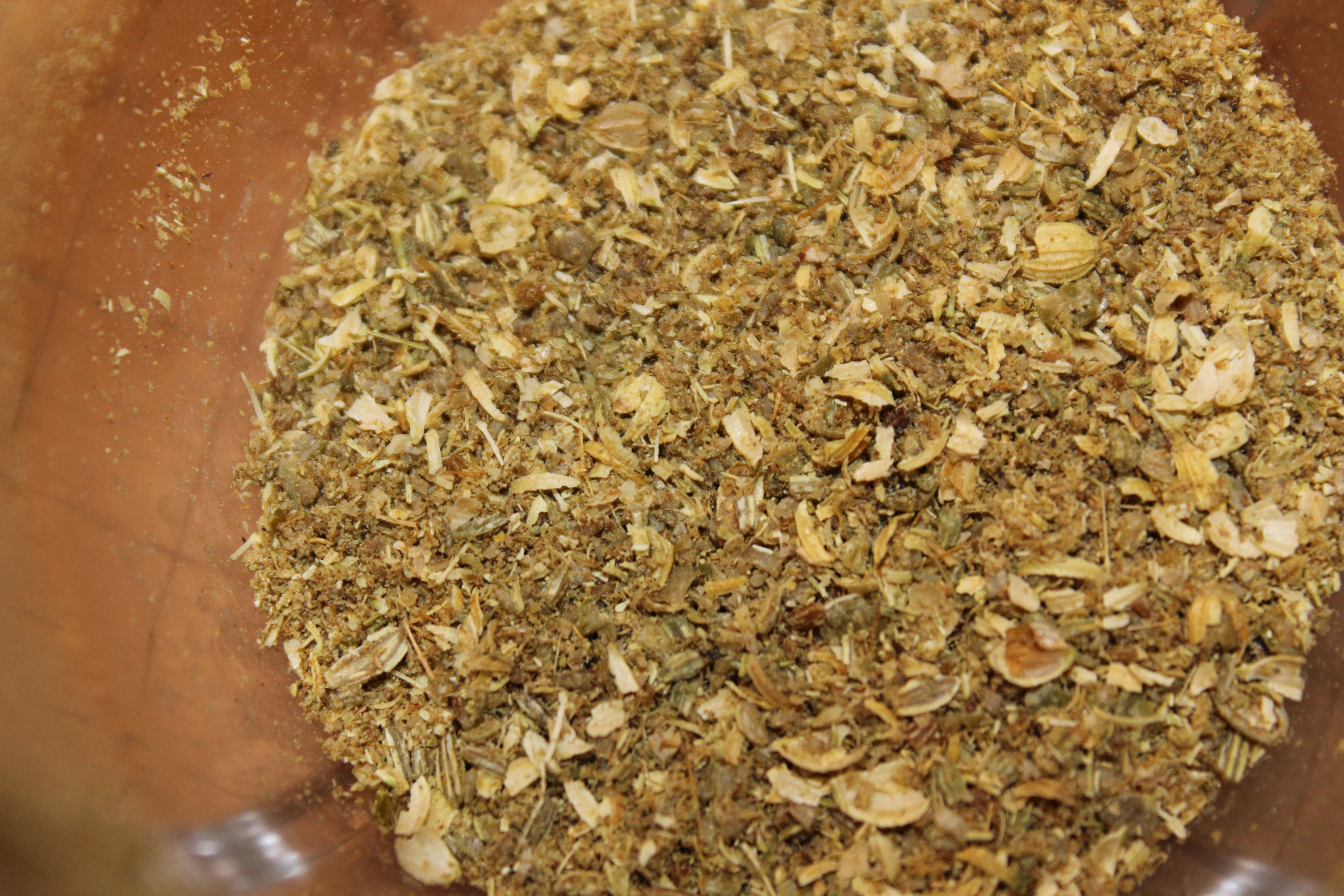 • Freshly grind some whole spices: I used about a tsp each of cumin and fennel seeds, a tbsp of coriander seeds, a smattering of peppercorns and a clove or two.