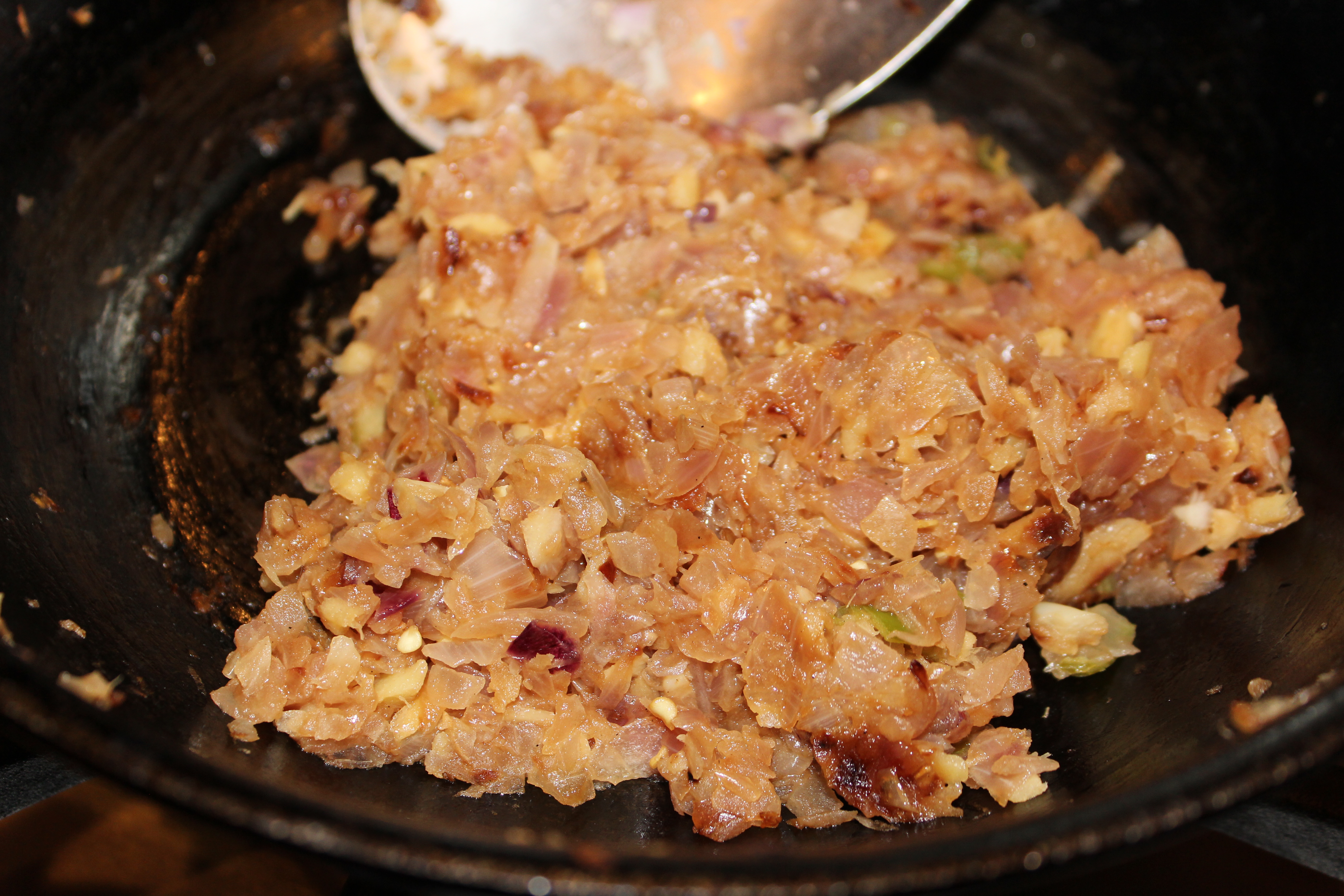 • Once the onion mixture loses much of its water, turn down the heat and continue to cook for about 10 min. until it comes together in one caramelized mass of sweet goodness.
