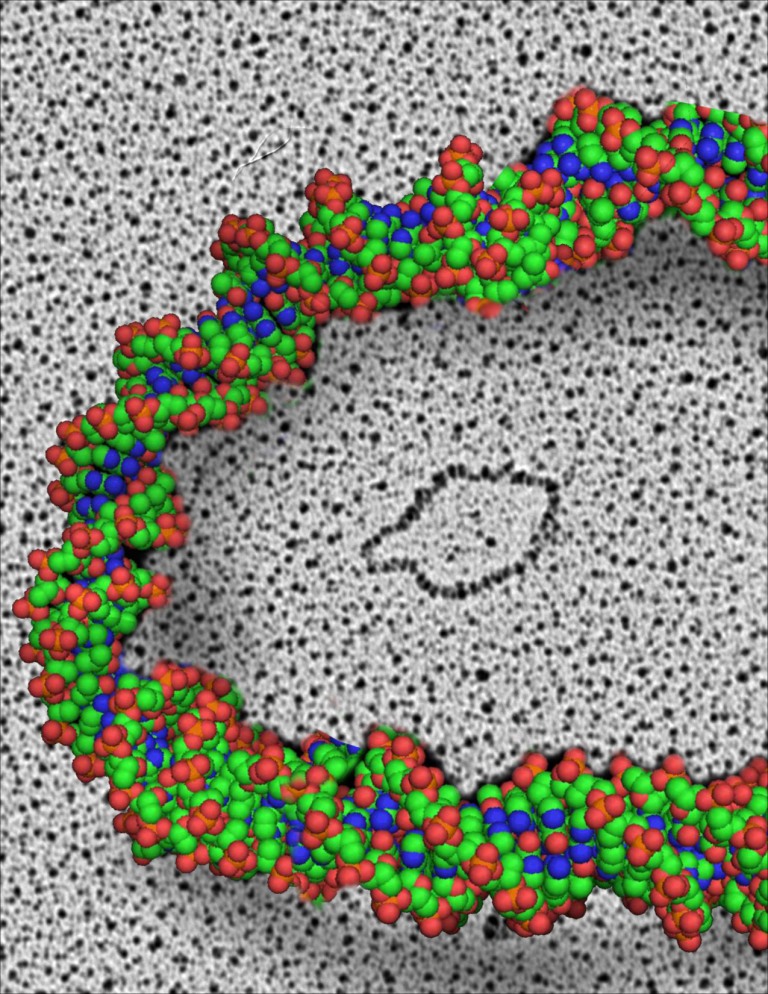• Searching for evidence of genetic mosaics within the brain, researchers found tens of thousands of tiny circles of DNA representing a completely different form from the usual chromosomes. These microDNA circles are typically 200-400 base pairs long, and represent only 0.2% of the total chromosomal DNA, but given that we have 3,156,105,057 base pairs of DNA that’s still a lot. They are thought to arise from genes due to errors in replication or repair. Both single and double stranded circles were found. The electron microscope image shows a microDNA circle with a larger molecular model in color on the outside.