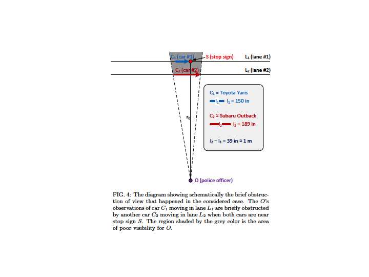 Arguing in court, he explained that the officer who issued him a ticket for driving through a red light had his sense of perception deceived by combination of three circumstances which induced a physical phenomena: “if a car stops at a stop sign, an observer, e.g., a police officer, located at a certain distance perpendicular to the car trajectory, must have an illusion that the car does not stop, if the following three conditions are satisfied: (1) The observer measures not the linear but angular speed of the car; (2) The car decelerates and subsequently accelerates relatively fast; and (3) There is a short-time obstruction of the observer’s view of the car by an external object, e.g., another car, at the moment when both cars are near the stop sign.”