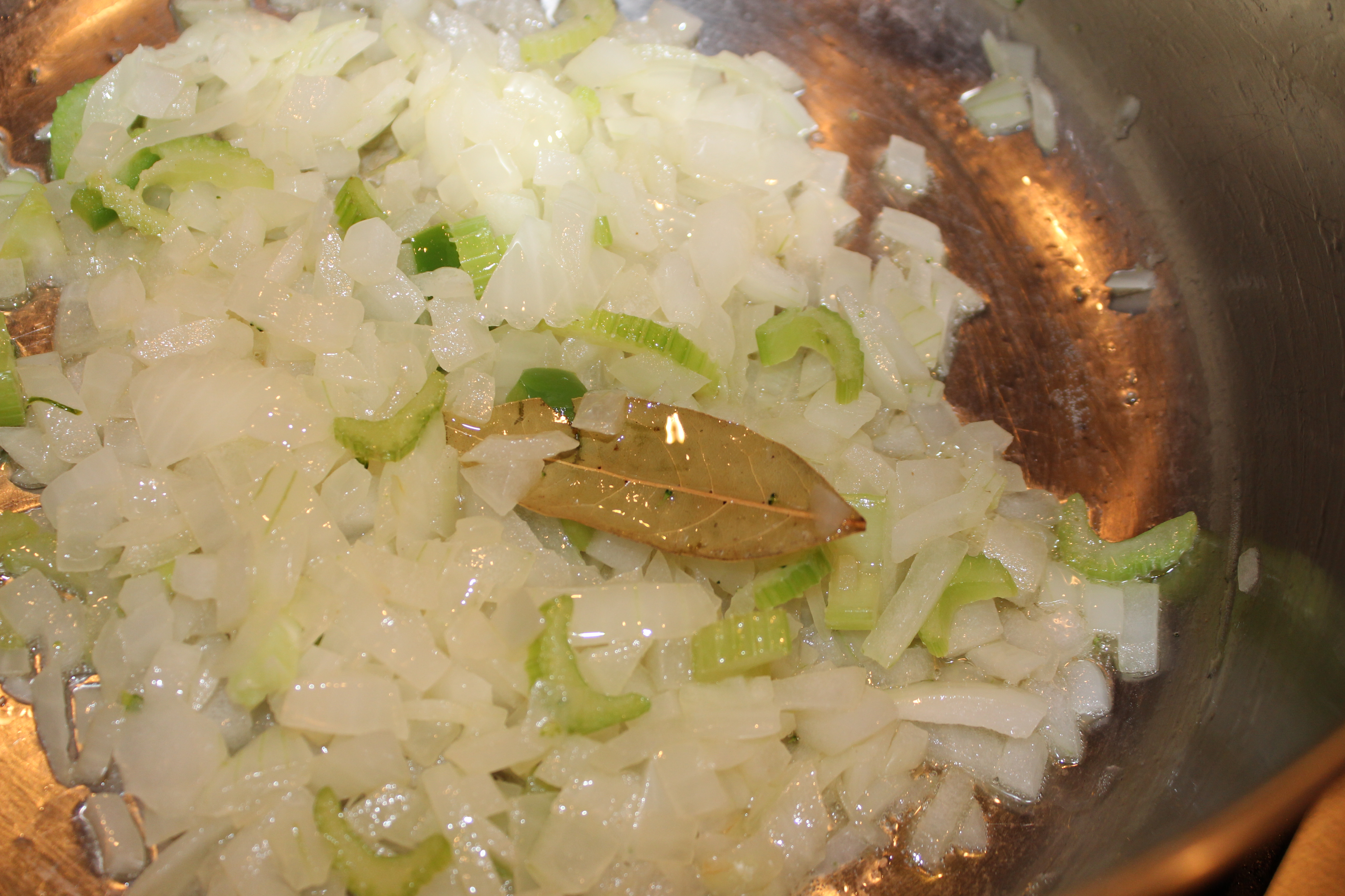 • Heat together, a large pat of butter (1-2 tbs) and a drizzling of olive oil in a heavy bottomed pot. The oil keeps the butter from burning. Add a bay leaf or two and let sizzle.