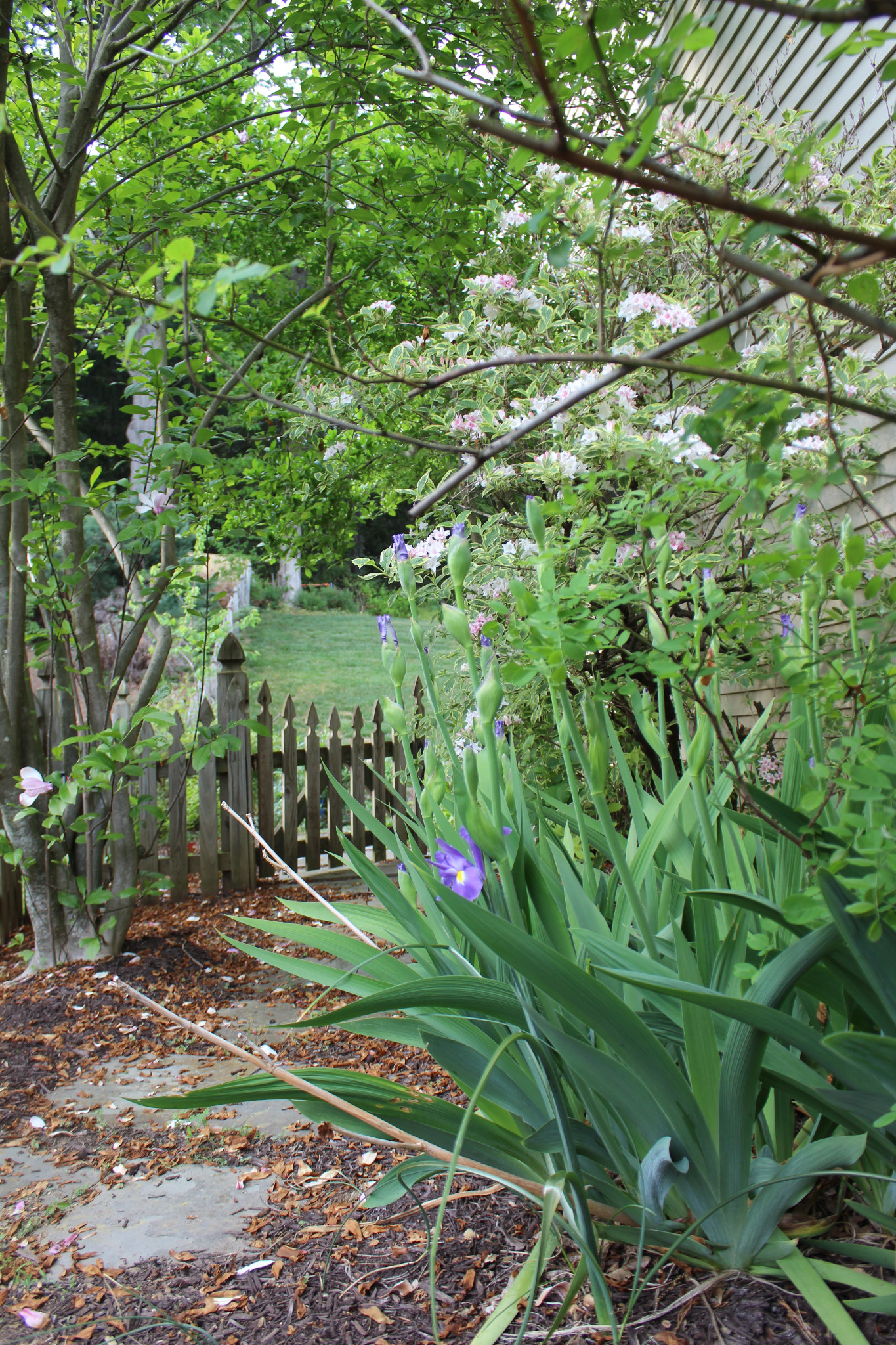 Freda Coursey , we think alike. The path curves through the gate to a brick patio where I have some wrought iron chairs and a slider bench πŸ™‚