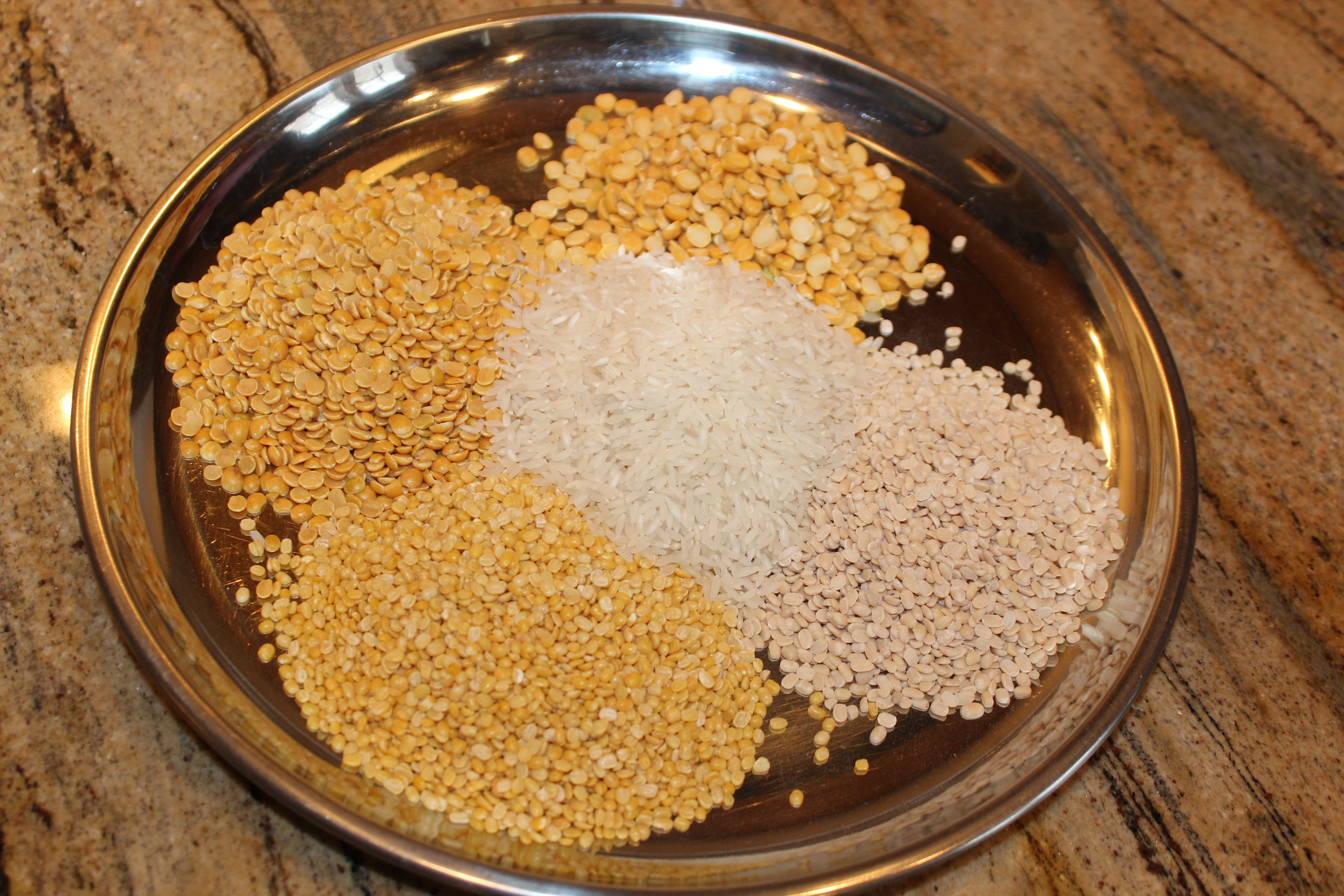 You will need rice, and four types of lentils: Tuvar dal, Channa dal, Urad dal and Moong dal.