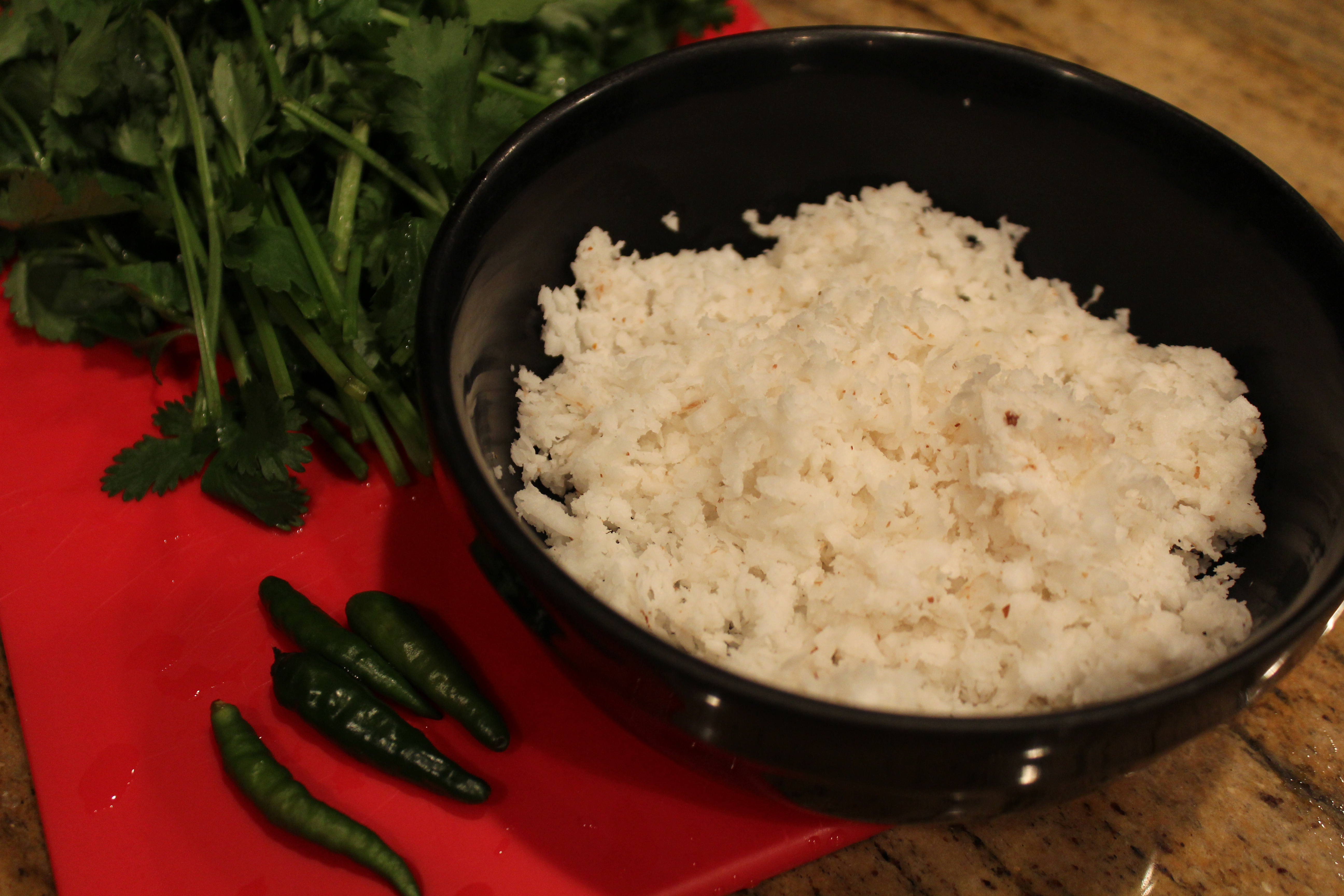 To make a chutney, you will need a bunch of coriander (cilantro), a cup of grated coconut (I buy mine pre-grated from the frozen section of an Indian grocery store), a teaspoon of tamarind pulp (from soaking dry tamarind pods, or as a concentrate), a few green chilies, and spices for tempering.