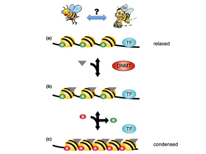 Epigenetics is the bees knees! It is the chemical modification of DNA over and above the underlying genetic code. DNA is wrapped tightly around histone proteins, like beads on a chain. (a) Relaxed DNA has chemically modified histones (green dots). This makes it open for business, inviting transcription factors (TF) to get to work transcribing a gene. (b) DNA methyltransferase (DNMT) adds methyl groups (grey triangles) to CpG dinucleotides. (c) This triggers different chemical modifications (red) to the core histone, to condense and inactivate the DNA structure. Genes are silenced when transcription factors cannot bind to them. So, is the division of bee labor decided by these chemical tags? Not to belabor this, but in short, yes.