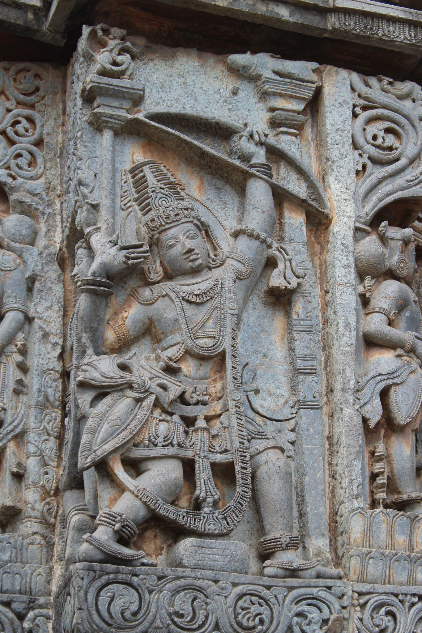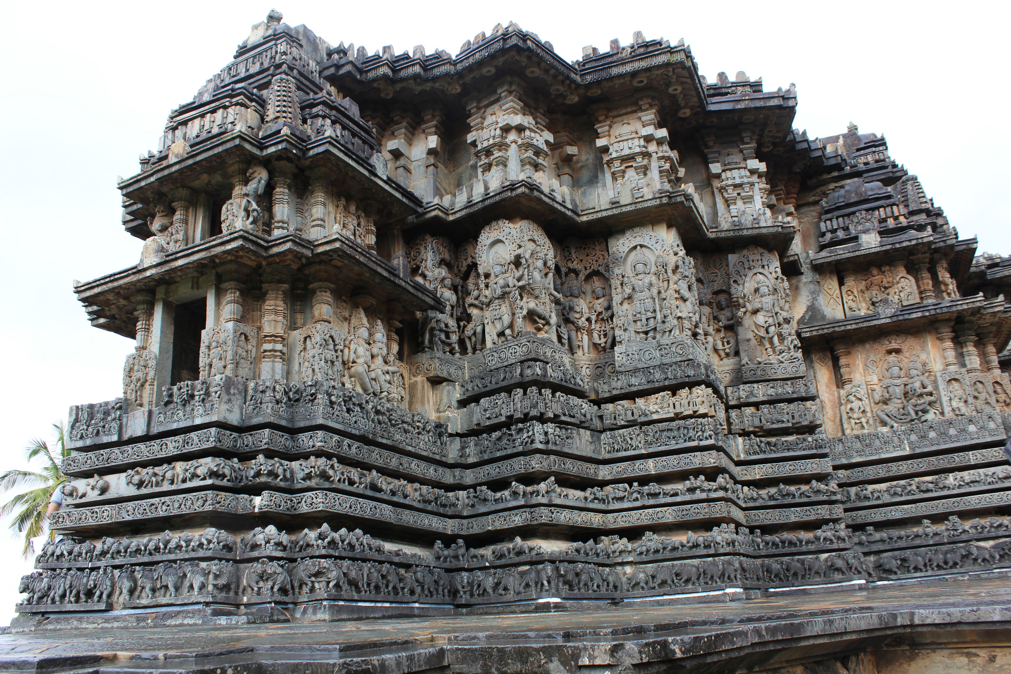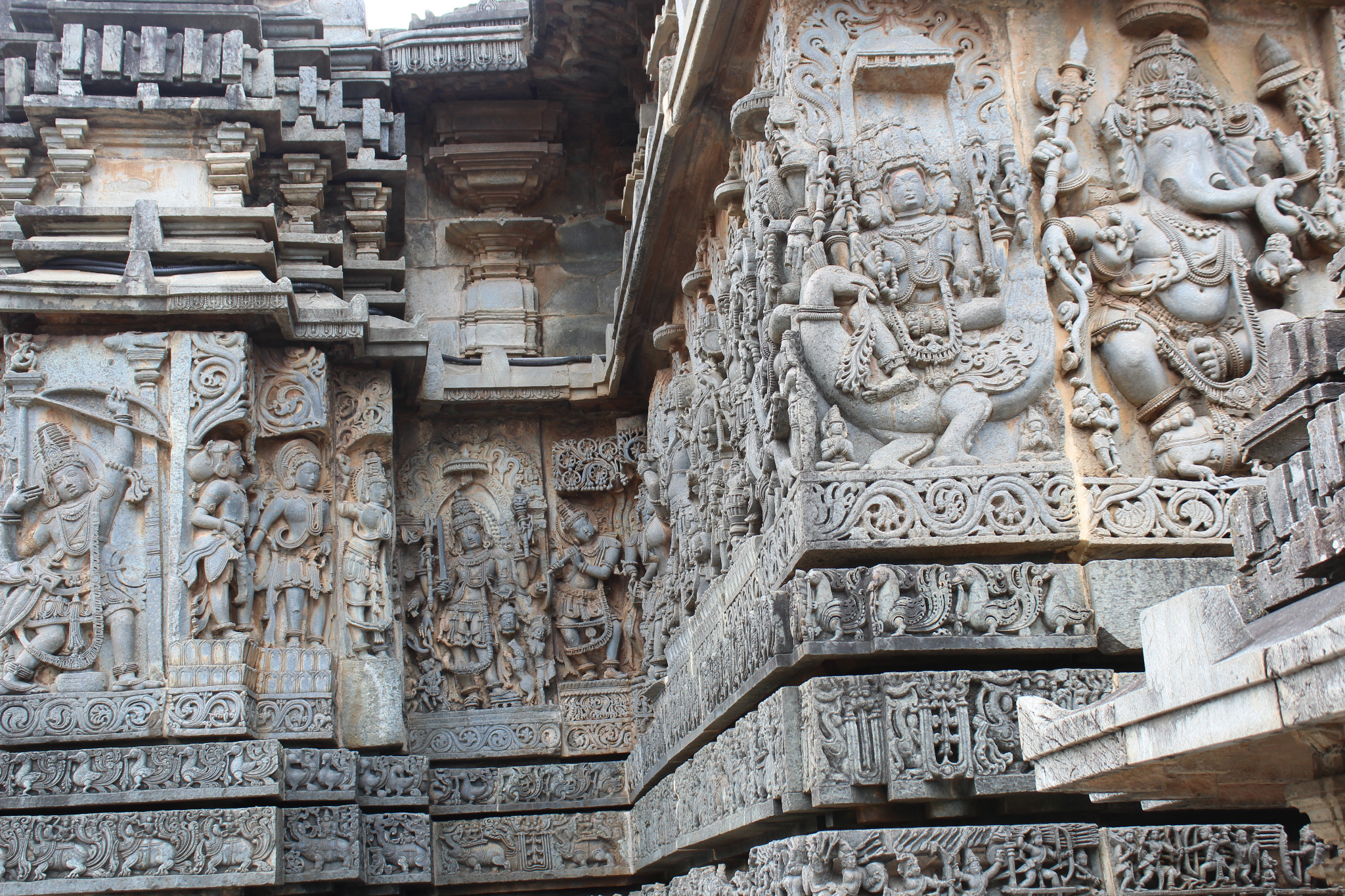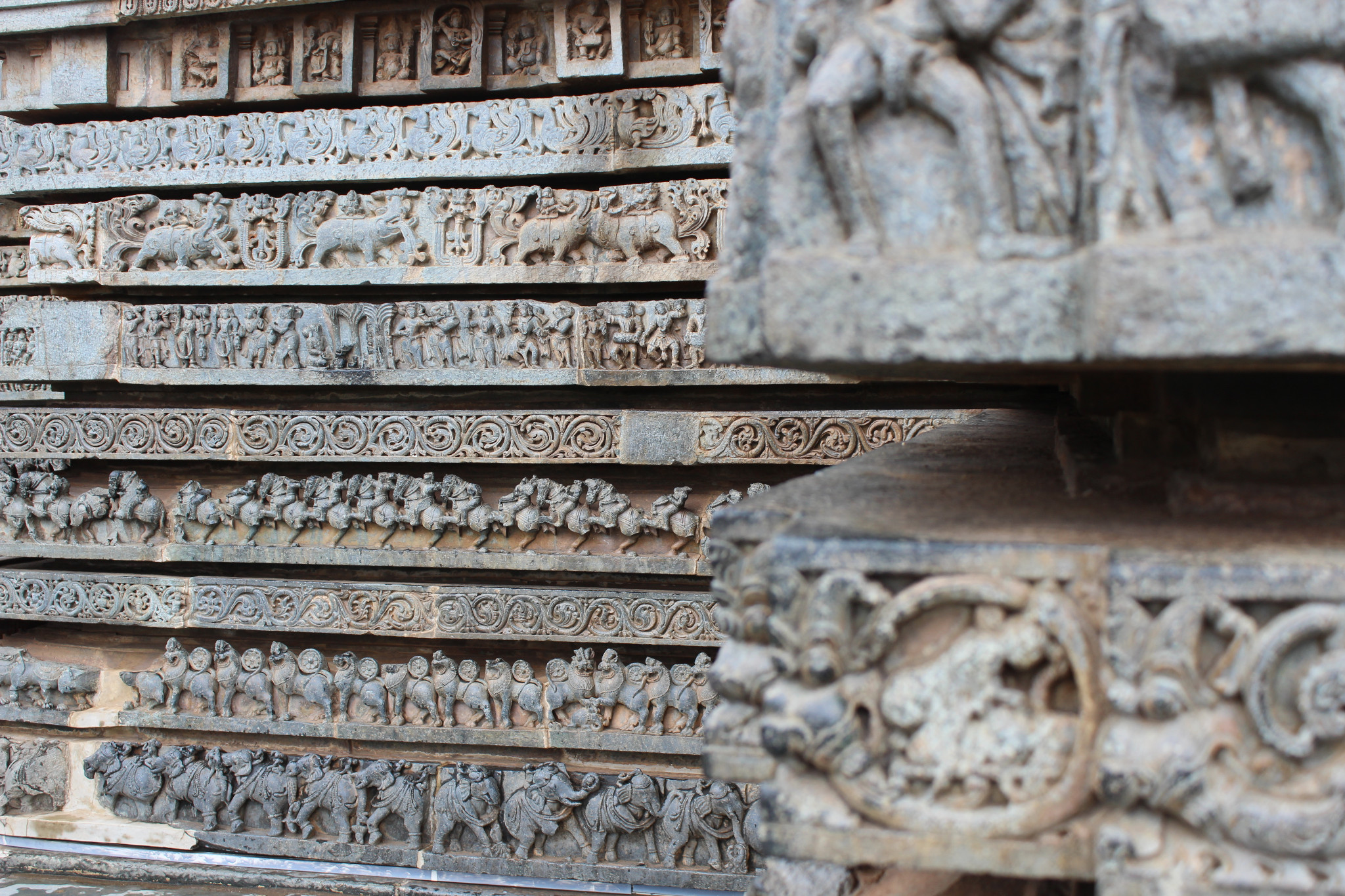 Hoysala Temples: Between the 11th and 14th centuries, the Hoysala kings in southern India  built distinctive temples characterized by a star shaped base built up with a complex profusion of images intricately carved from soapstone (chloritic schist) running in parallel lines along zig-zag walls.