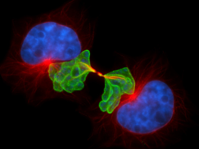 This clever protozoan, Theileria (in green), aligns itself with the mitotic spindle (shown in red) as if it were a chromosome. When the spindle of the dividing host cell pulls apart to form two nuclei (in blue), the parasite goes along for the ride. Theileria infects cattle via tick bites and resides in white blood cells. Other disease causing protozoan parasites like Plasmodium and Toxoplasma also co-opt microtubules to help in cell invasion. This new finding means that drugs that target microtubules could block parasite spread.