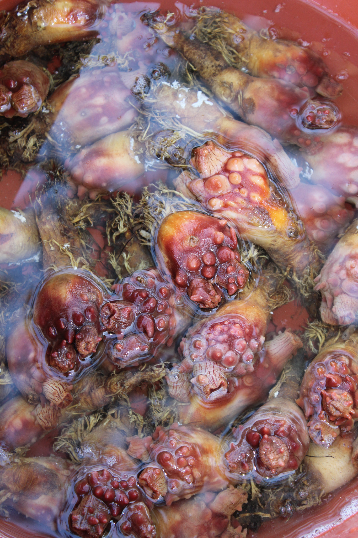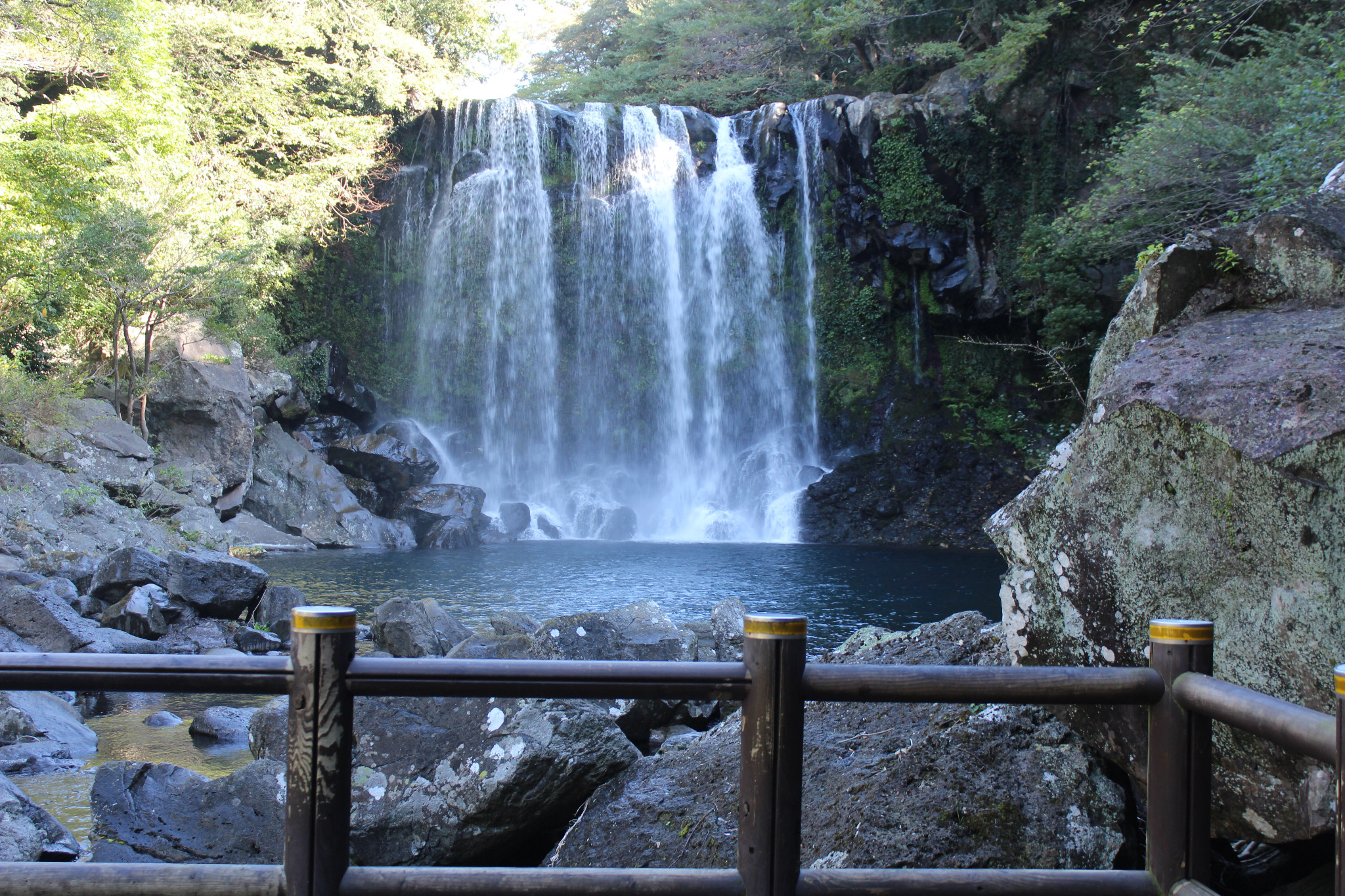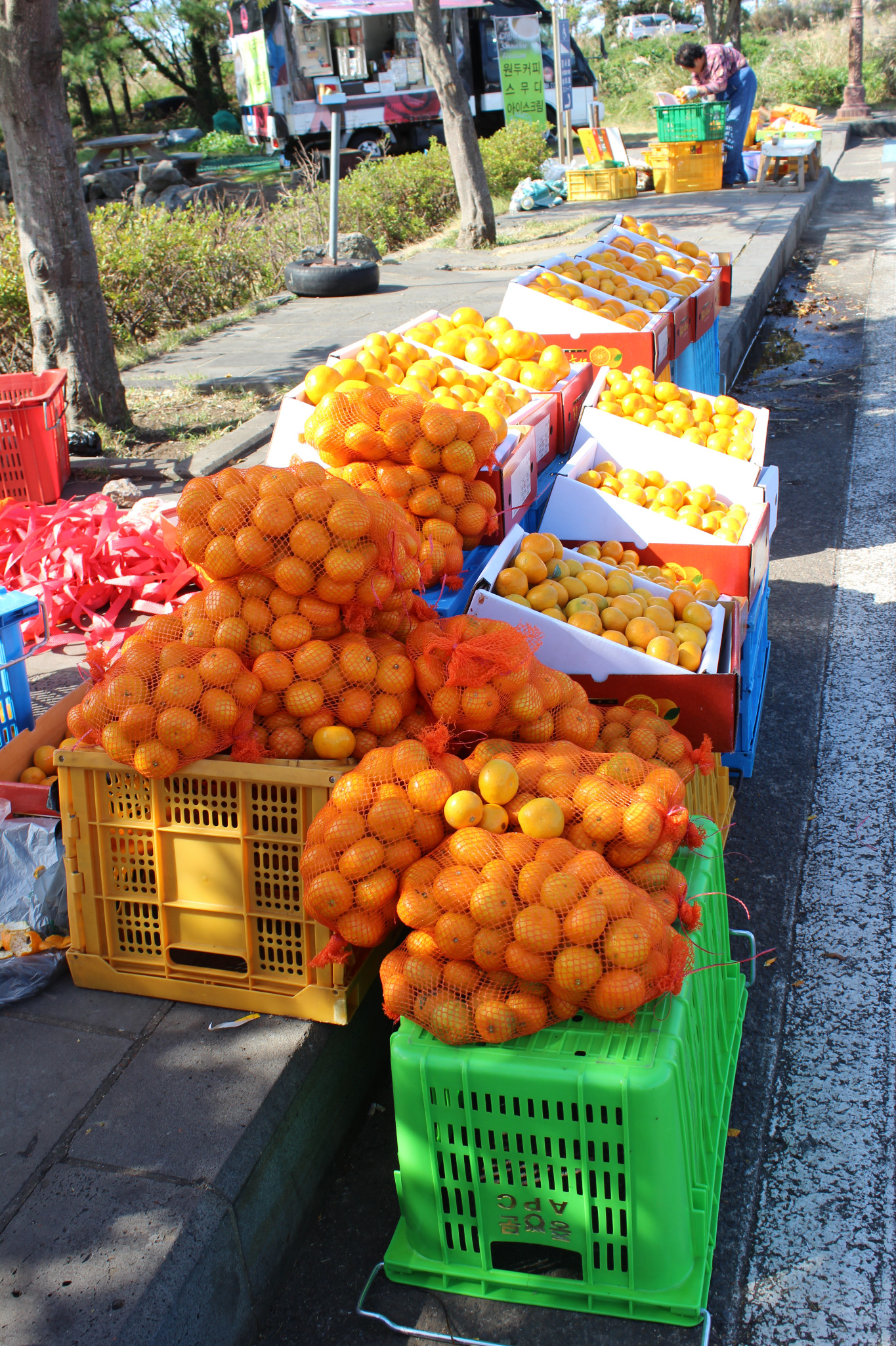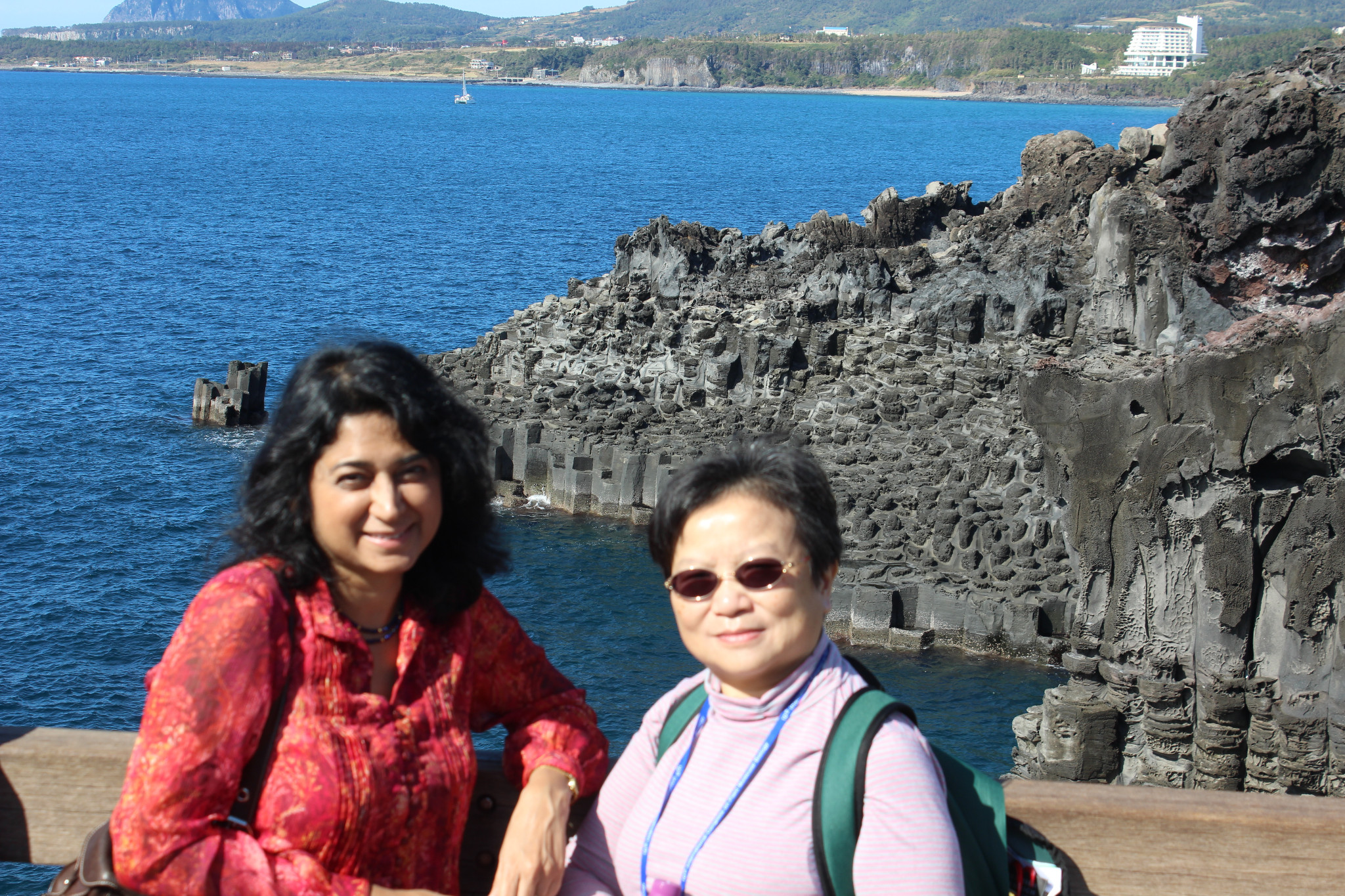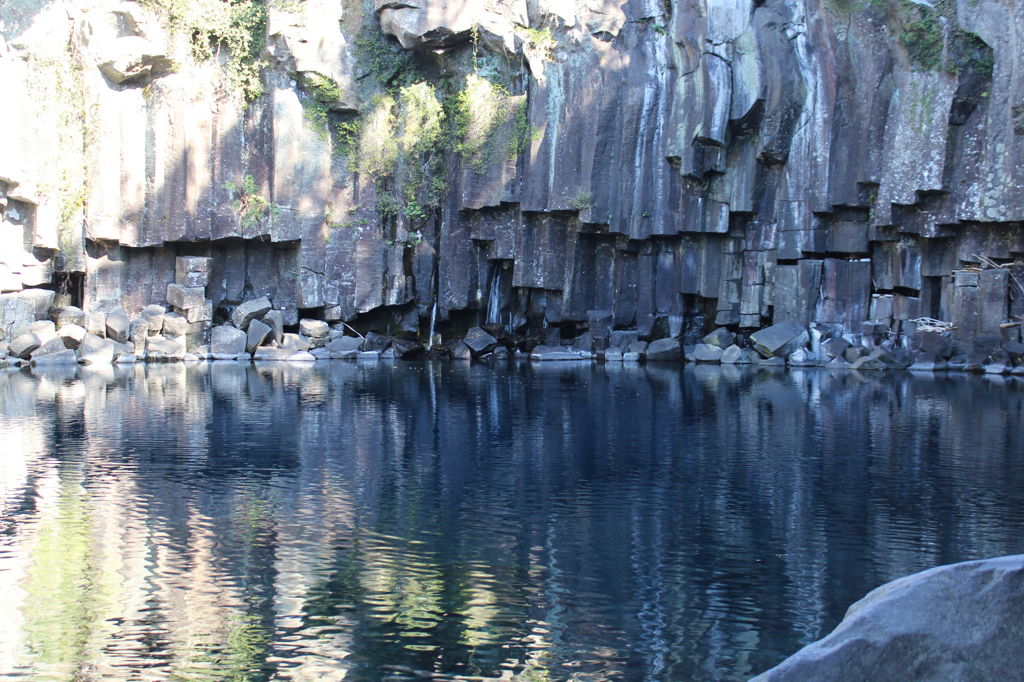 • My recent junket to South Korea, purportedly on the invitation of the International Plant Biology conference, took me to Jeju Island.  Dominated by the central Halla-san volcano, this temperate island has waterfalls plunging into the glittering ocean, skates drying in the wind, and tangerine groves galore.  I spotted these geological formations of columnar basalt along the southern coast of Jeju island at Jusangjeolli (주상절리), and at the three-tiered Cheonjeyeon Waterfall.