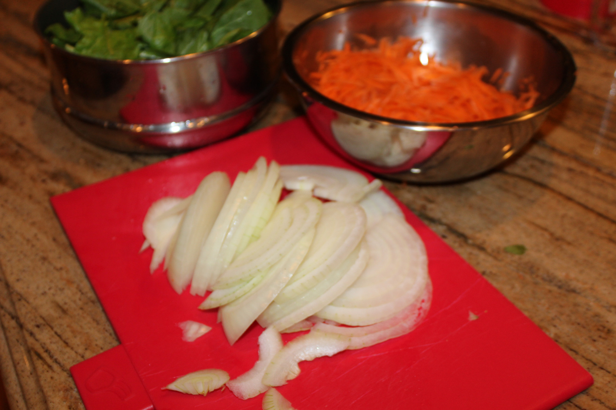 3. Prepare the Veggies: Grate two carrots, wash the spinach and set aside. Thinly slice one large onion.