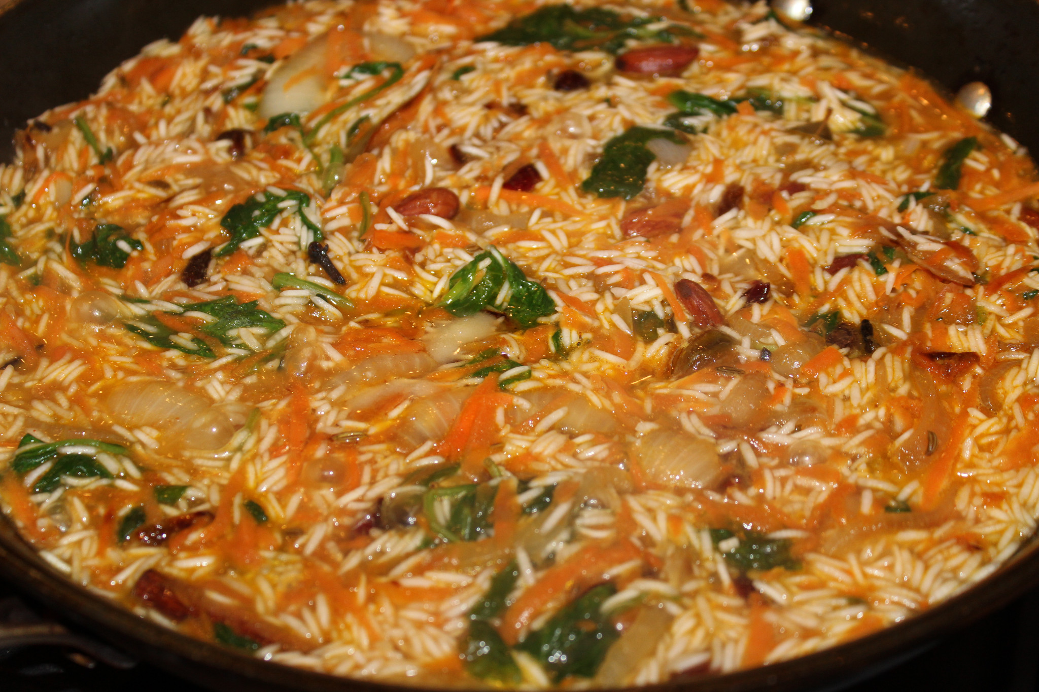 6. Heat 2-3 tbs of oil in a heavy bottomed pan. Add the spices. When they sizzle, add the sliced onion and fry until lightly browned. Then add the grated carrots and spinach, and stir in. Add the mixed nuts and dry fruits. Add the presoaked rice and mix in very gently (so as not to break the grains).