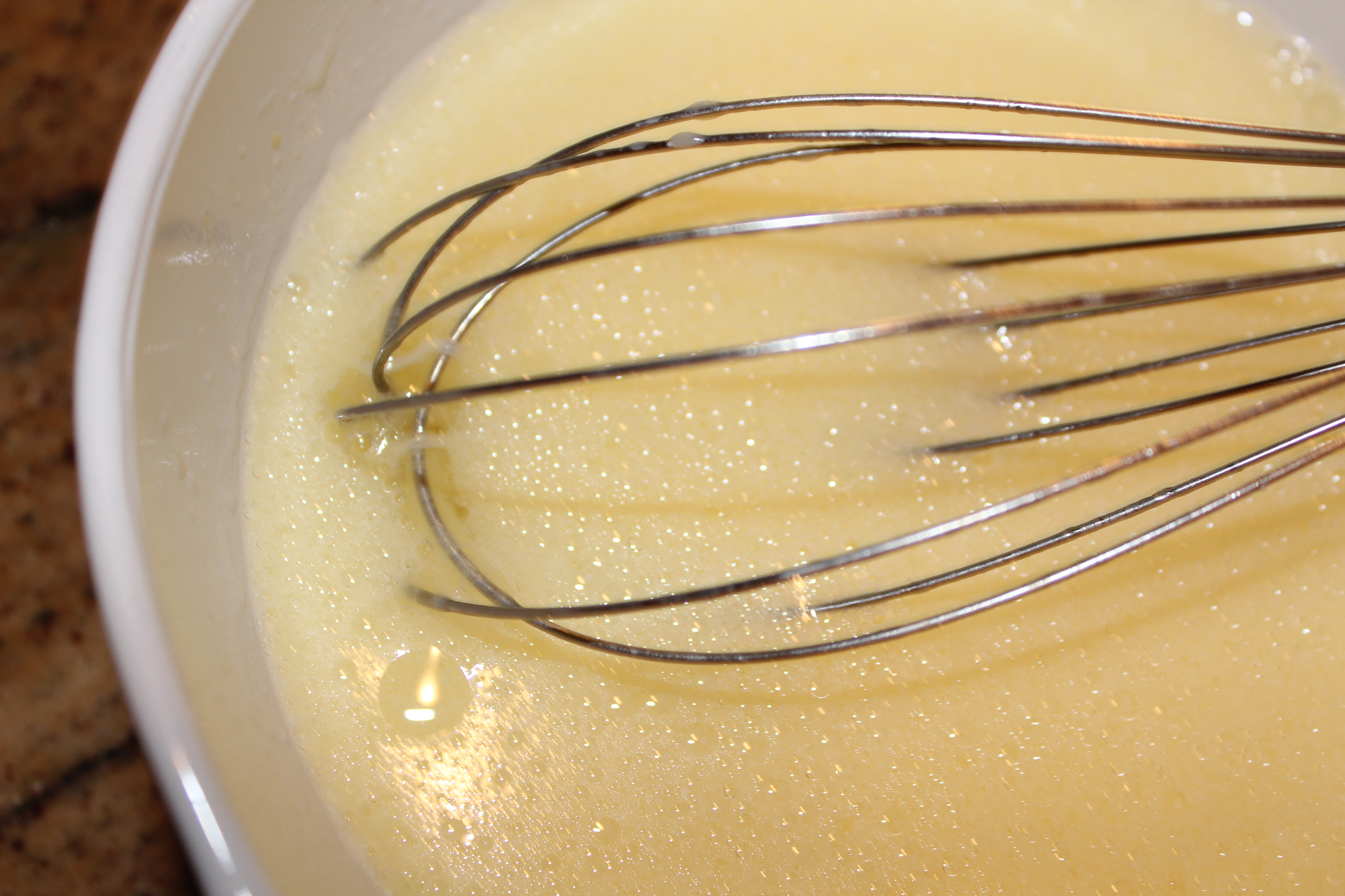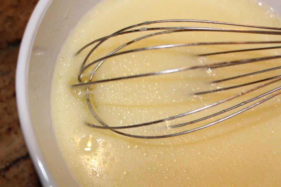 Whisk together the milk, OJ, eggs and oil.