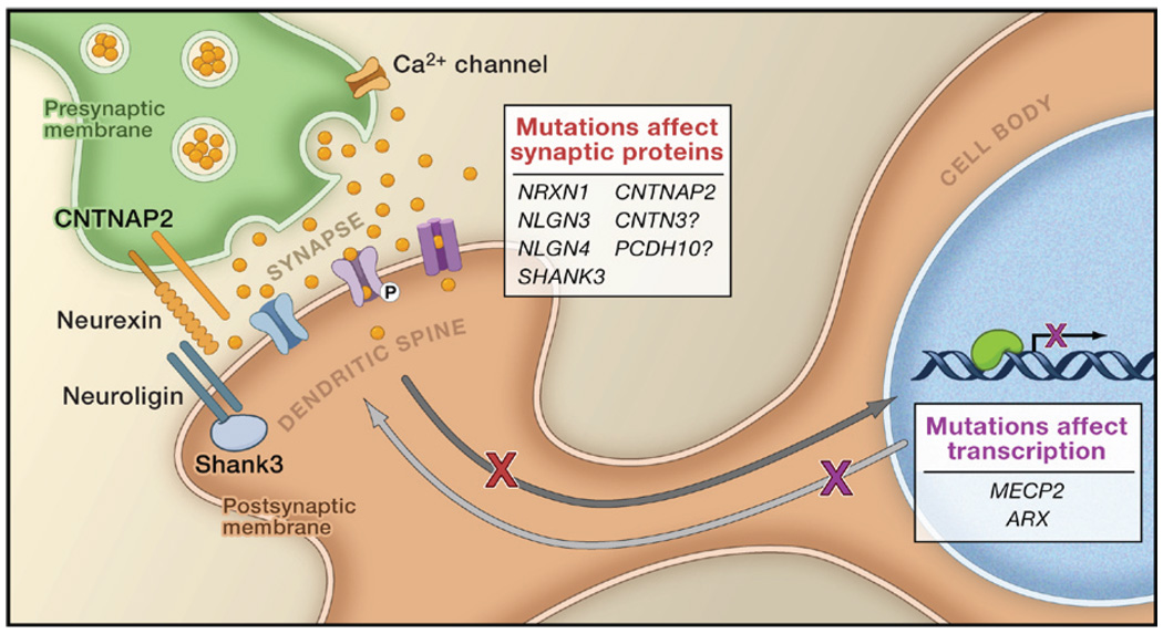The synapse: Information transfer occurs at the synapse or junction between neurons. The first synapses in human cortex appear 40 days after conception. The most dramatic change takes place around birth. During the first three years of life, more synaptic contacts are formed, but only some will be stabilized. Many genes implicated in autism (image) function at the synapse, and the timing of appearance of autistic characteristics coincides with synapse maturation.