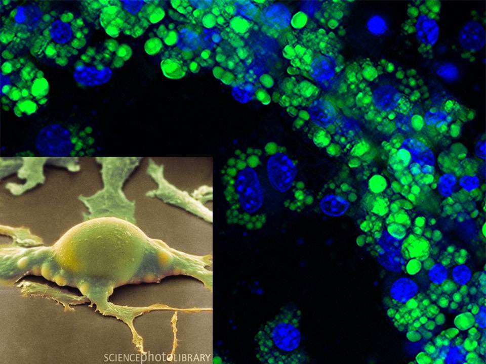 Image: 3T3-L1 derived adipocytes stained for lipid droplets (green) and DNA (blue). Finalist, GE Healthcare cell imaging competition, 2012 ▶ http://goo.gl/hkzBE Inset, colored scanning electron micrograph of a fat cell. Most of the adipocyte’s volume is taken up by a large lipid (fat or oil) droplet. Fat accumulation starts with a few small lipid droplets which coalesce to make one large droplet. Magnification: x10,000 when printed at 10 centimetres wide.  ▶ http://goo.gl/sZ6hp