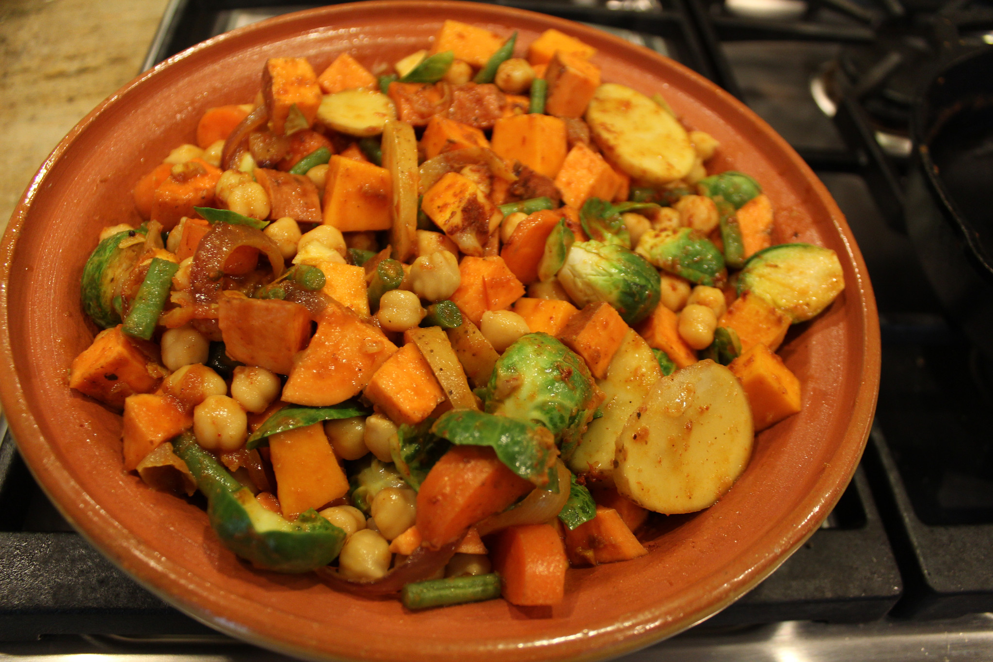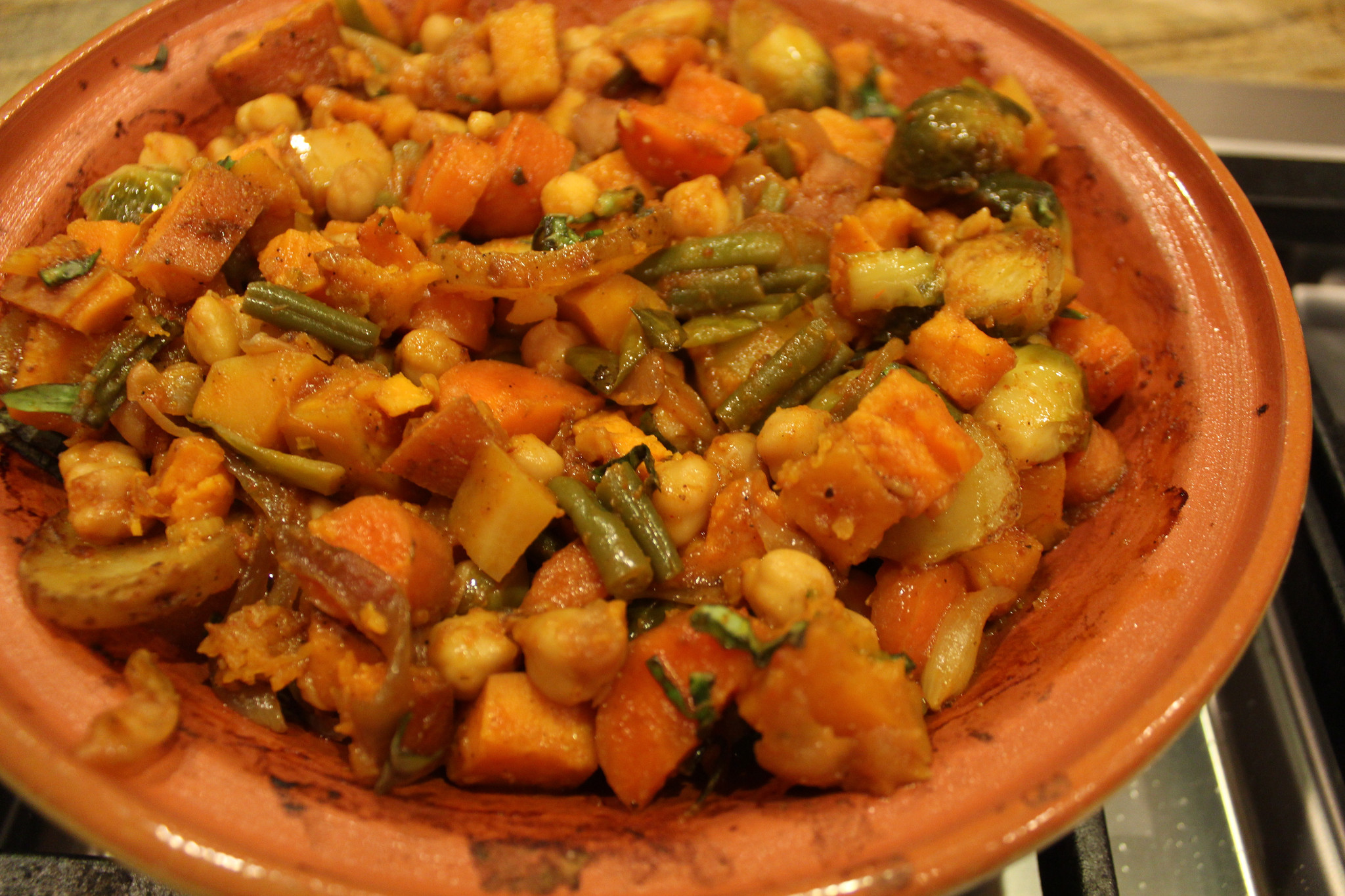 • Online, opinions and advice flew in, fast and furious. You’ll need a heat diffuser for the stove top. Don’t place it in a preheated oven. You have to temper it first. Just use it as a serving dish. The clay will leach heavy metals. Never wash it until completely cooled. Intimidated, but determined, I applied the same (lack of) logic I use to call upon divine spirits to bless our laboratory research. I soaked the tagine overnight, then rubbed in some olive oil, and baked it for an hour despite a strong suspicion that the glazing on the pot made this exercise unnecessary. I sent my husband to the store for some tagine spices. Prudently, he purchased every exotic mix he could find: Harissa, Za’atar, Ras-el-hanout. The aromas were all-too familiar though: cumin, coriander, turmeric, cinnamon. “Mom, you’ve been had”, the 14 year old wisely concluded, “It’s Garam Masala”.