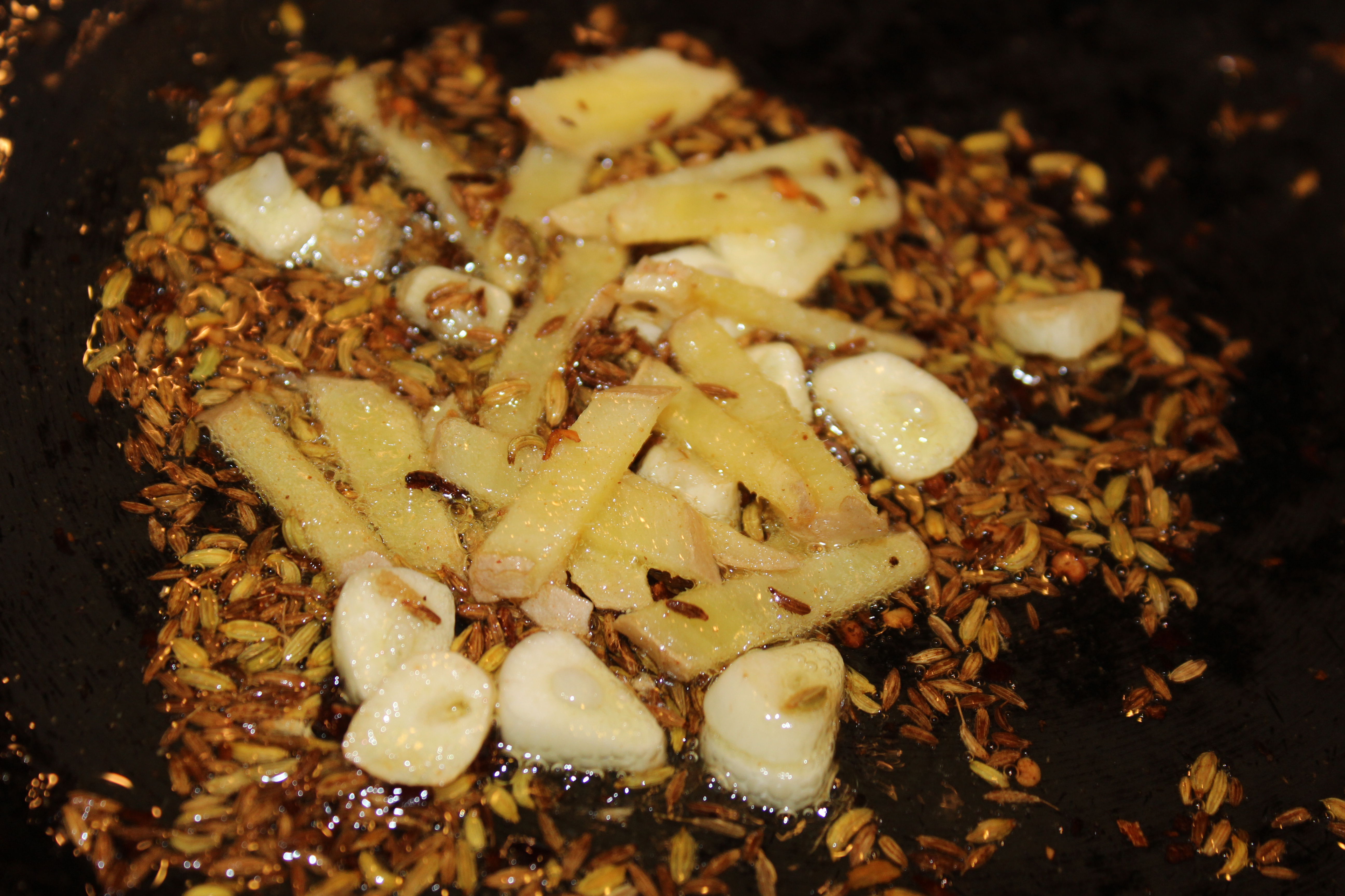 Not being Paula Deen, I was not going to ham hock the living daylights out of these innocent botanical beauties, boiling them blandly for hours with only salt and pepper for company. Instead, I began by flavoring a couple tablespoons of hot oil with a satisfying sizzle of cumin seeds, fennel seeds and crushed red pepper flakes. To this, I quickly added some slivered ginger and sliced garlic.