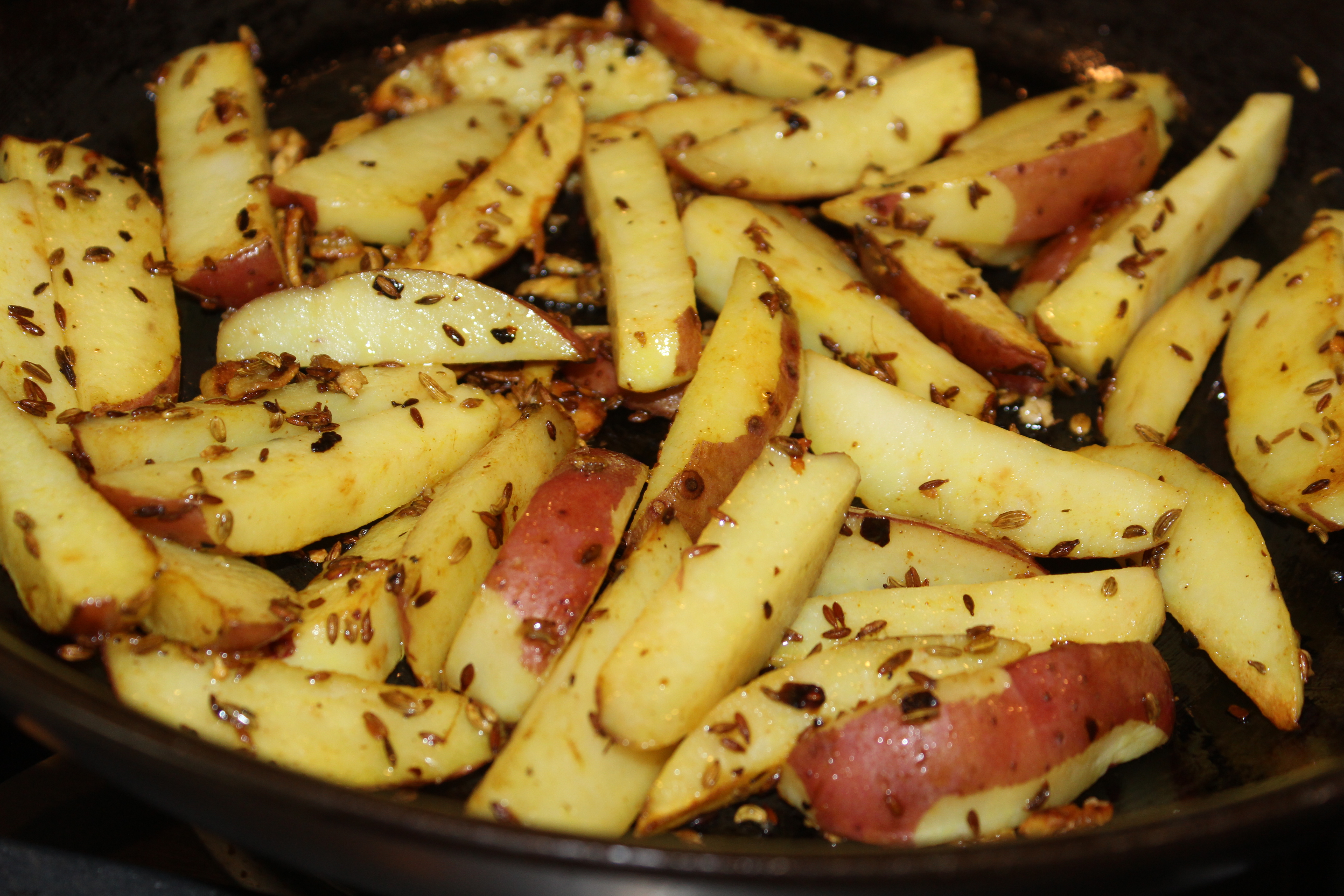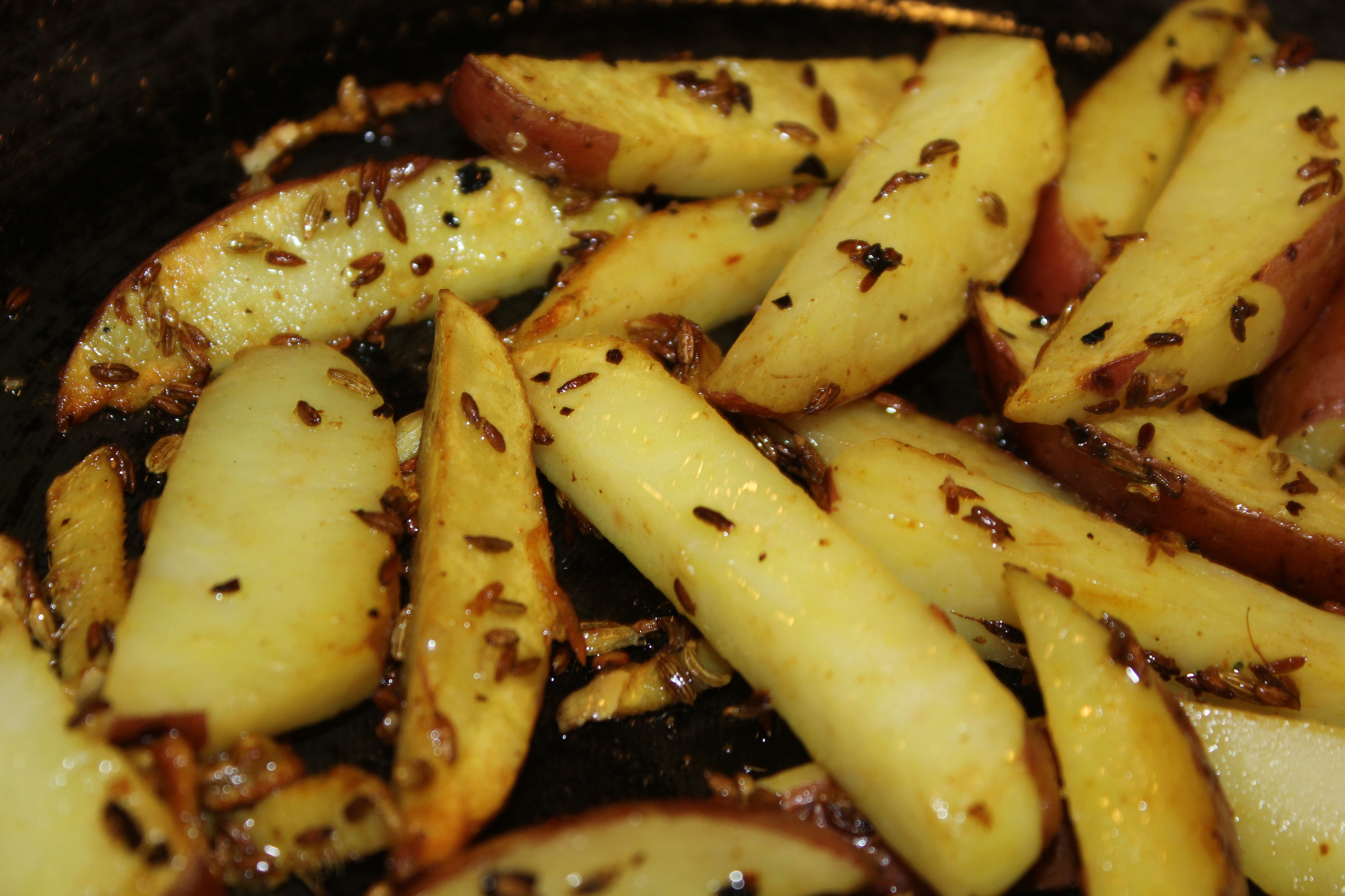 Next, I added lengthwise-sliced potatoes. I used three medium sized red ones. Tossed them in the spices and flavored with a big pinch of turmeric and coarse salt. Covered and cooked on low until the potato slices were nearly done, crispy and slightly browned on the outside.