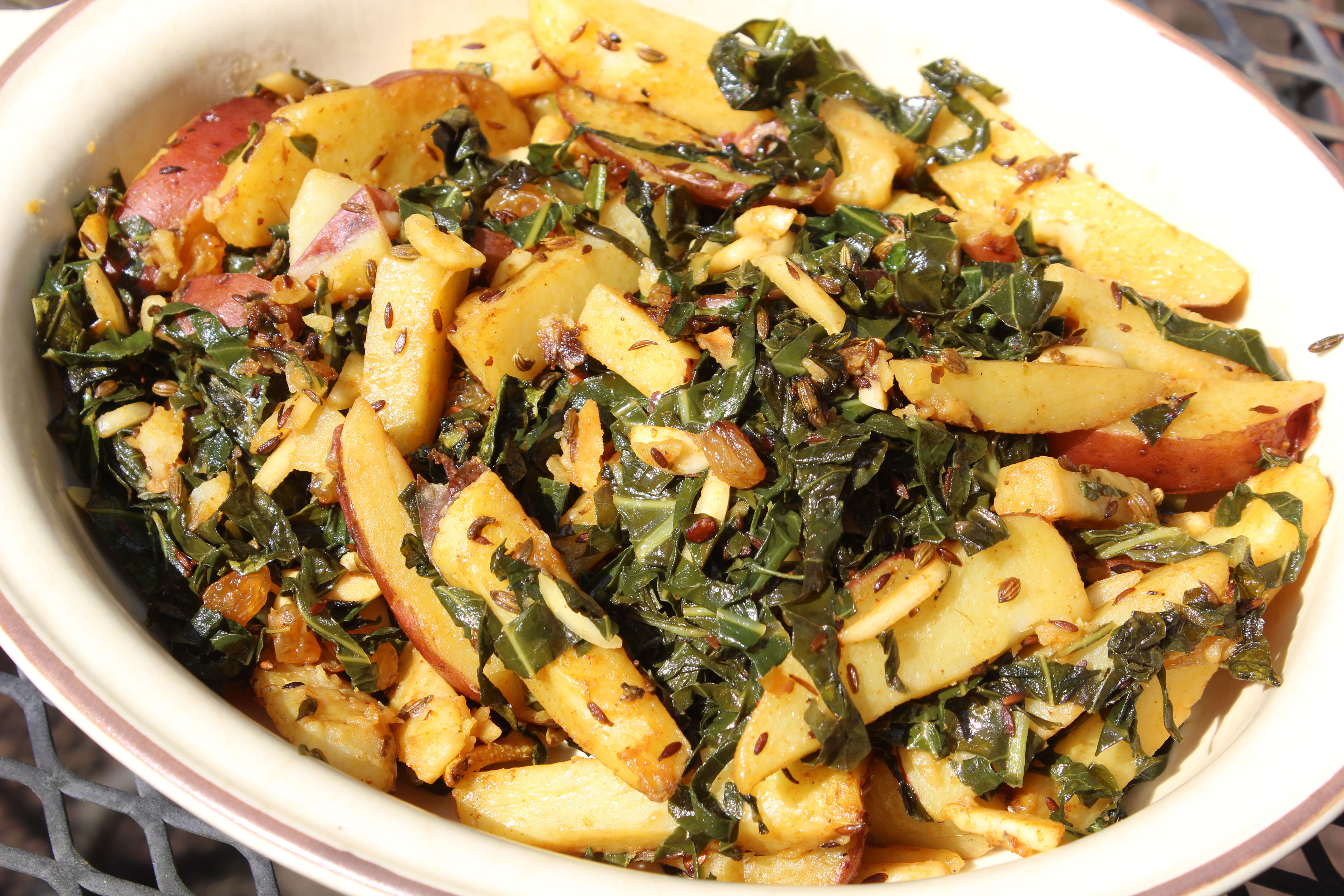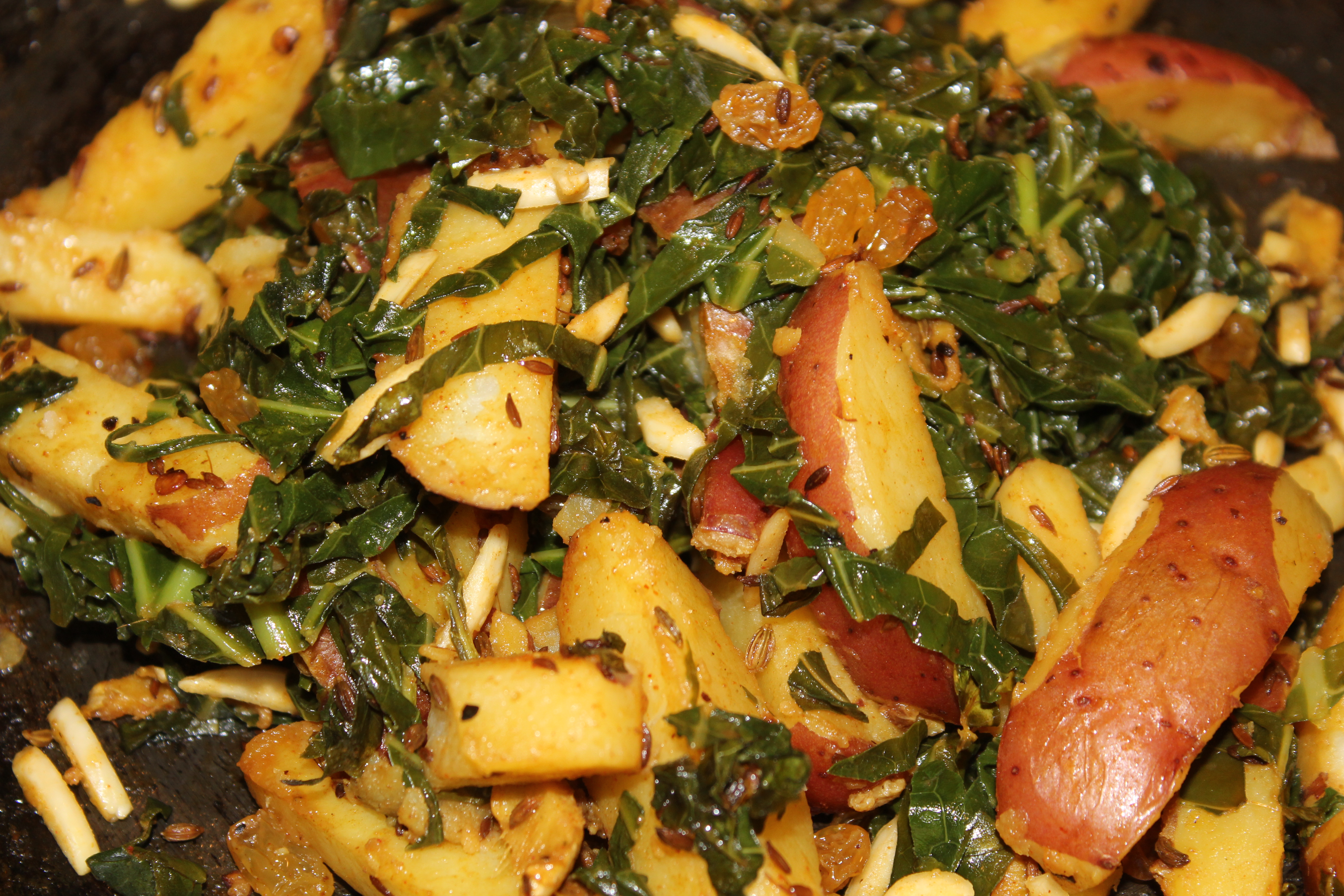 Layer on your favorite spice mix: I have an ongoing love affair with Tagine spice, so that’s what I used. Squeeze some fresh lemon juice over it all. At the last minute I tossed in a handful of golden raisins and sliced almonds. Why? Because they were there. If George Mallory could set forth for Mt. Everest “because it’s there“, surely I may be permitted to ad hoc my ham-hockless collard greens sans Deen? 🙂 This was so good that my 14 year old picked off collard festooned potato wedges every time he found an excuse to walk by.