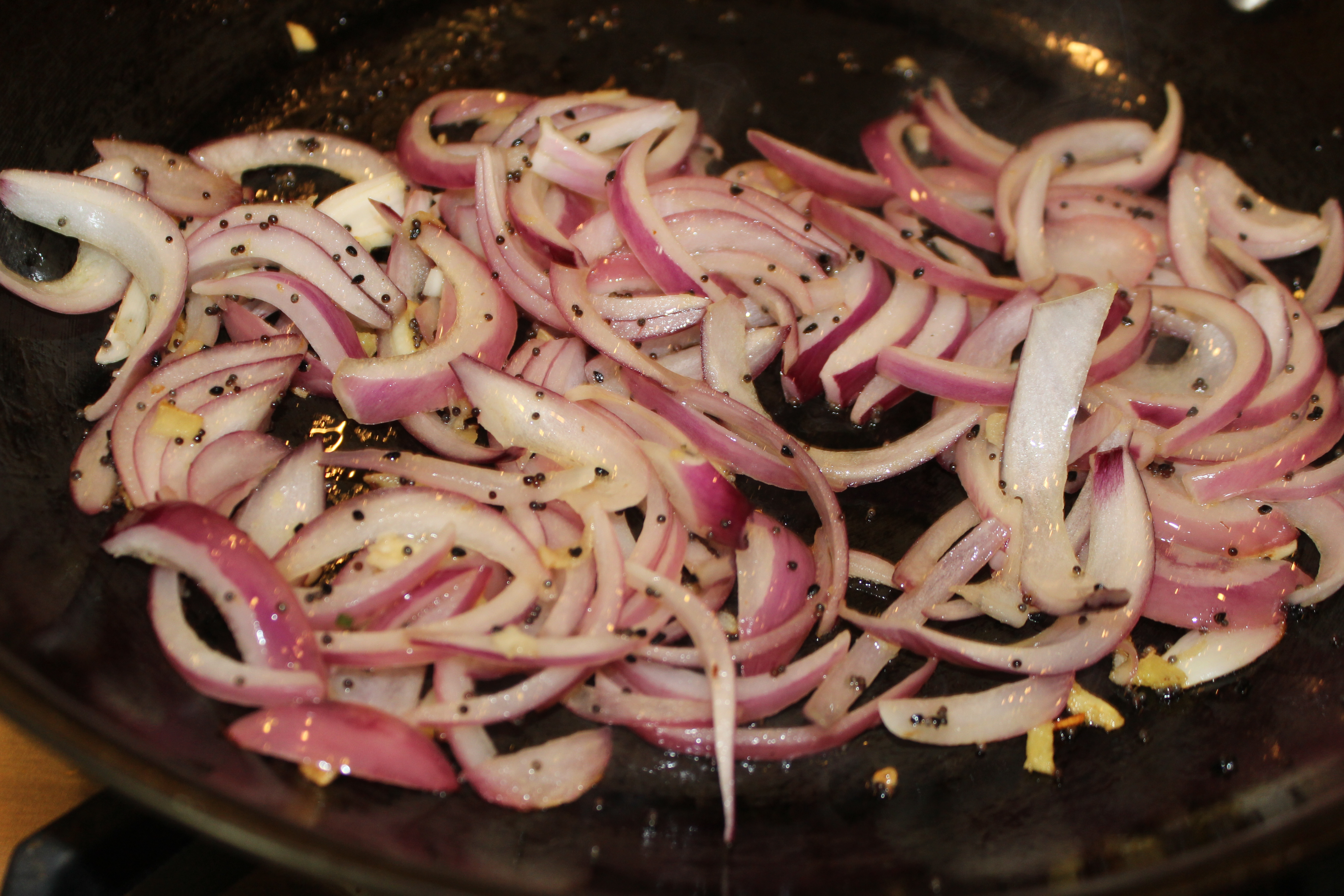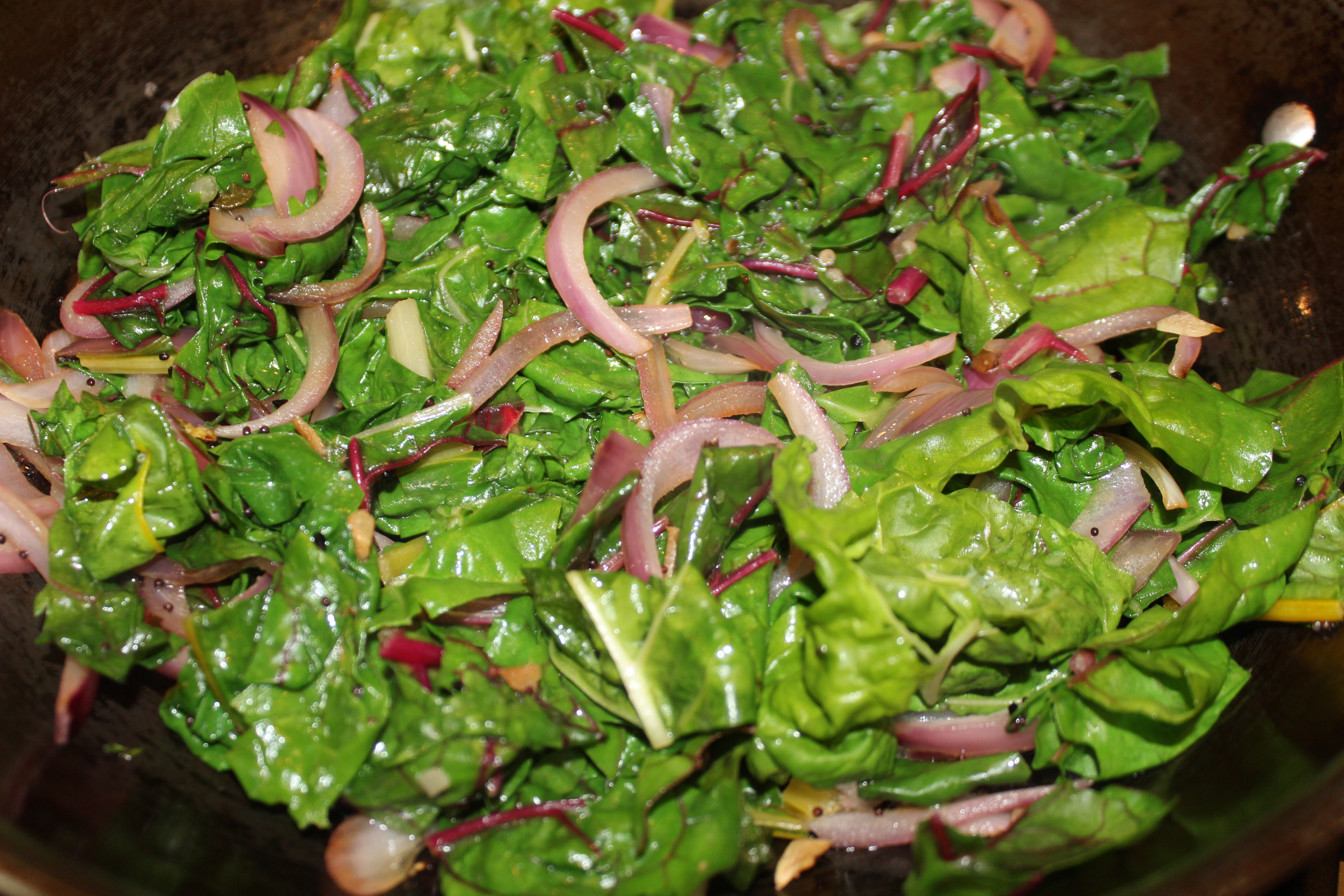 I made this dish because I had some pre-cooked mix of lentils (split urad dal and mung dal) languishing in the refrigerator. This time, I added black mustard seeds and nigella seeds to a tablespoon of clarified butter or ghee. These infuse a slight bitterness and texture to the smoothness of the dal. When the mustard seeds popped, I added a sliced red onion and tossed it on high heat. The shredded chard was mounded on, but it quickly collapsed into a more manageable mass.