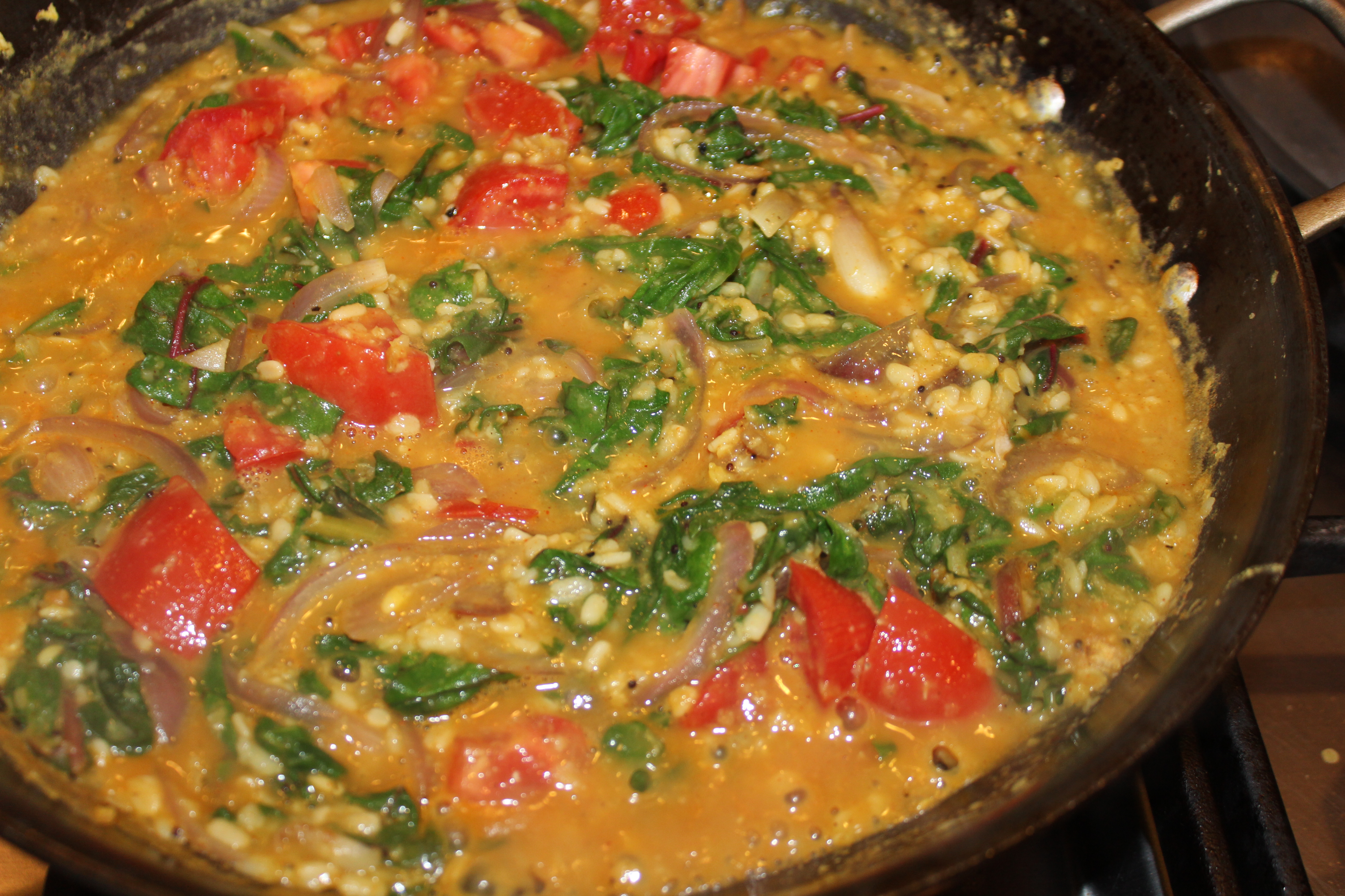 Next, I added the cooked dal, a couple of diced tomatoes and flavored it all with salt, turmeric and ras al hanout, which is really a fancy Moroccan version of garam masala. This also received the benediction of freshly squeezed lemon juice at the very end.