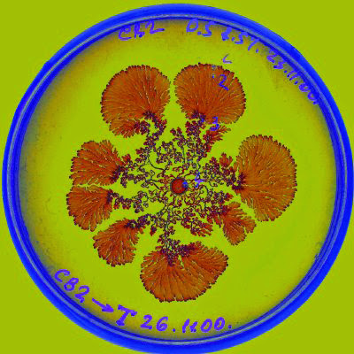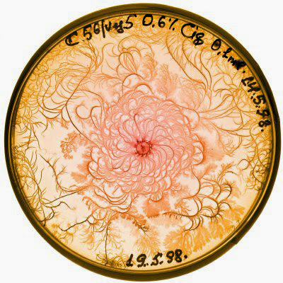 ✺ The humble Petri dish has inspired some beautiful art. The plates below were cultured in the laboratory of Professor Eshel Ben-Jacob (Tel Aviv University). You can admire the fractal fronds of microbes ▶ http://goo.gl/n4aky