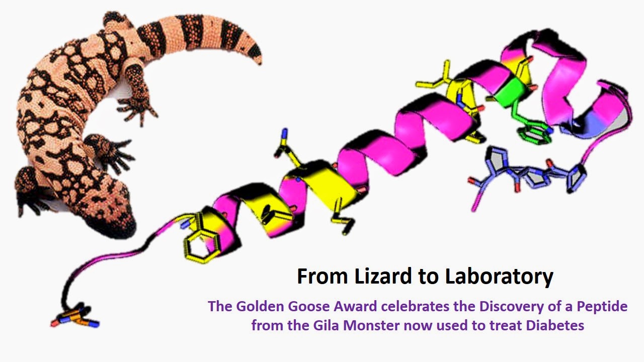 The Golden Goose Award celebrates federally funded research that is seemingly obscure but turns out to have an unforeseen positive impact on society. This year, the prize goes to Dr. John Eng whose discovery of the peptide exendin-4 from the venom of the 2-foot long pink-and-black Gila Monster has provided relief to millions of diabetics.