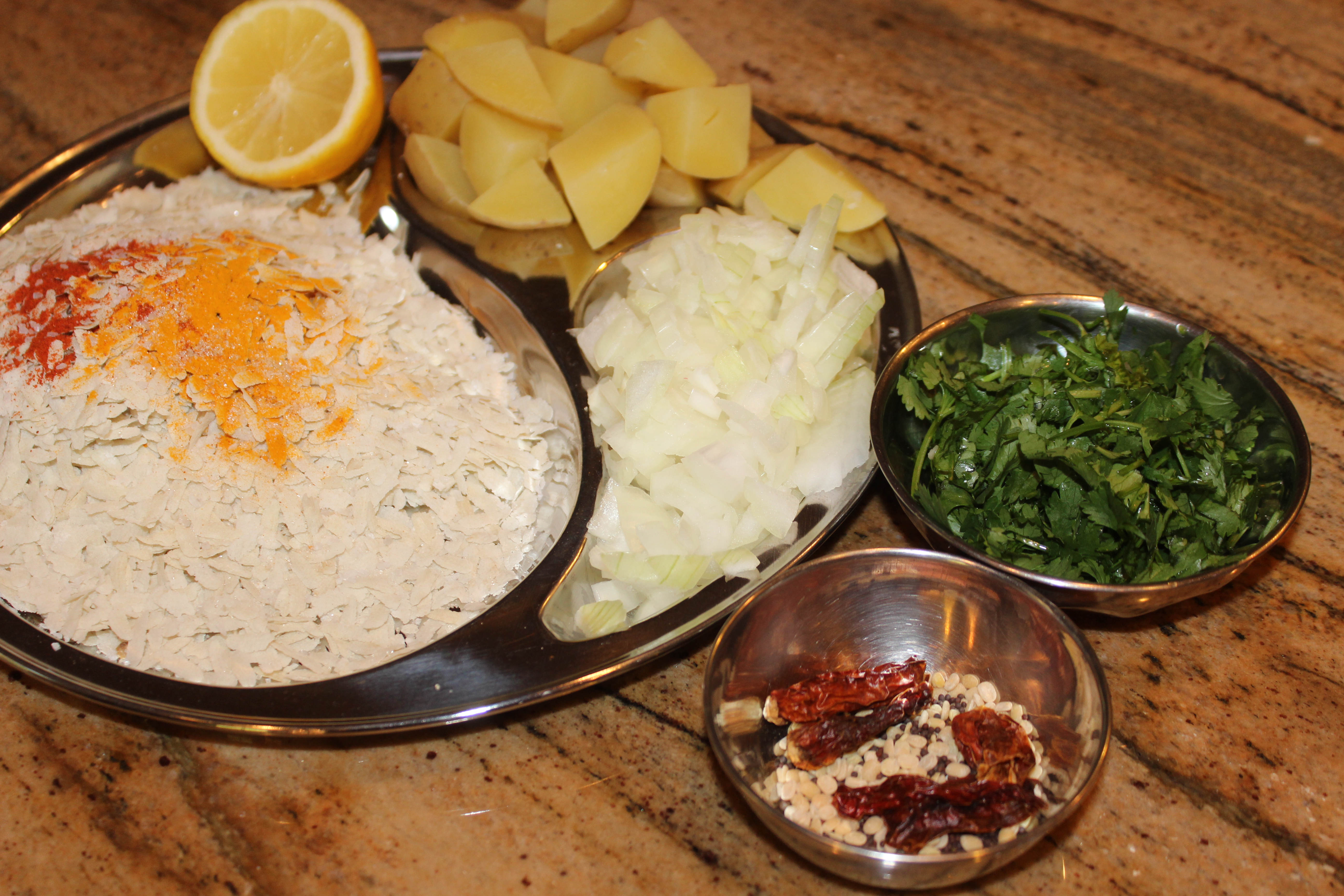 Clockwise from top: boiled, diced potatoes, chopped onion, chopped cilantro, whole spices for tempering (urad dal, dry red chilies, mustard seeds), poha with spices (turmeric, cayenne, salt and pinch of sugar), half a lemon.