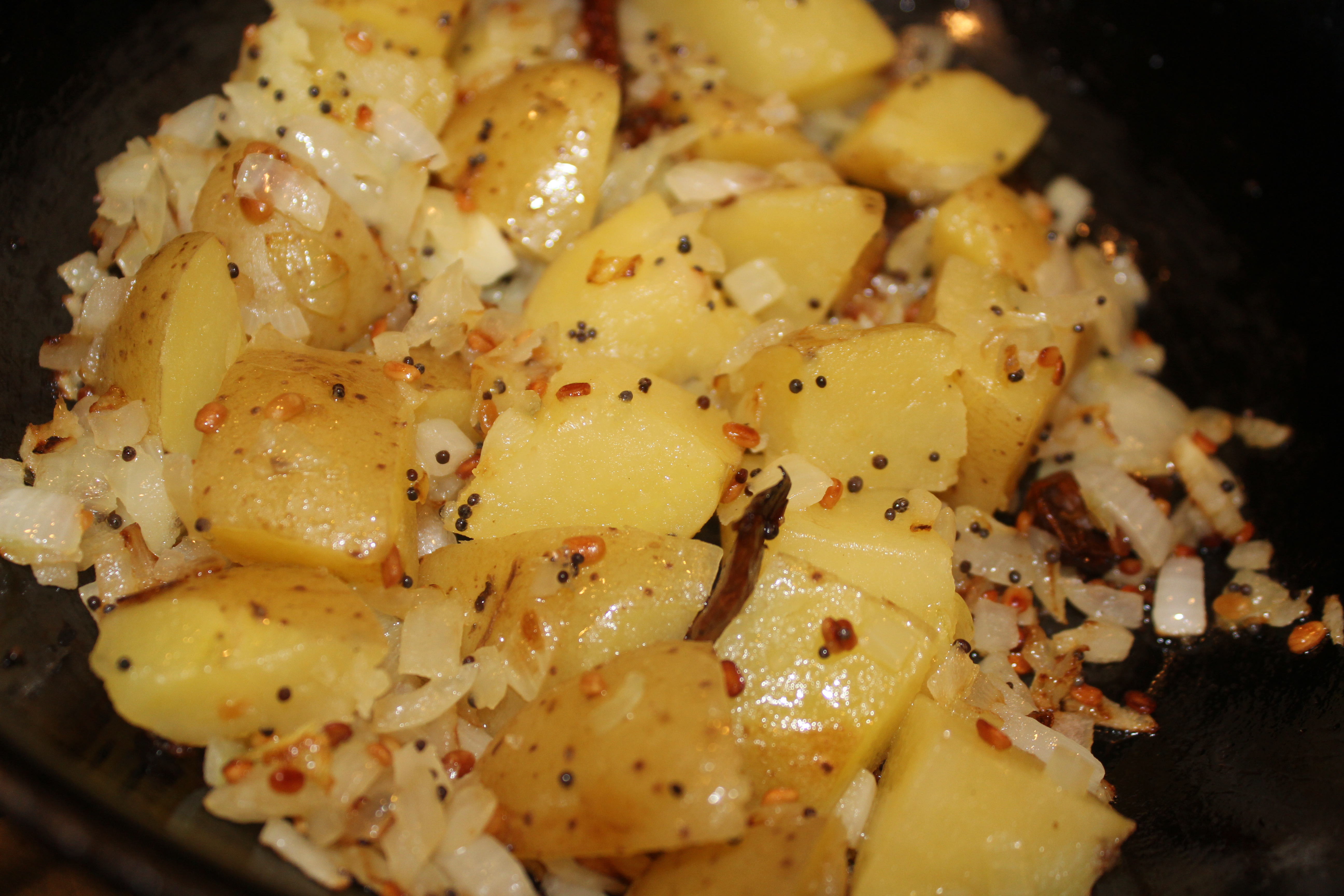 After the tiny mustard seeds pop in a tablespoon of oil and the urad dal and chilies release their flavor, add the onion and lightly saute.