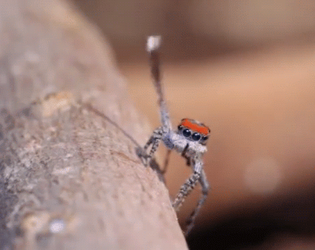 Doing the Y: Only 4 mm in size, the Australian male peacock spider (Maratus volans) puts on an impressive courtship display, rivaling the Village People in Peacock Spider Dances to YMCA . Described by researchers as multi-modal, the dance includes 3rd leg waves, synchronized unfurling of colorful belly flaps, abdominal bobbing and pedipalp flickers. As if these visual displays were not enough, the spider generates bursts of vibrations carried through the ground to signal his passion for his lady love.