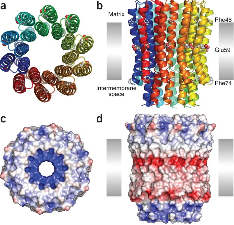 Protons are ferried by the the c ring (image a), as in a merry go round. Each subunit carries a proton binding site (Glu59, image b), as it rotates. Images c and d show the electrostatic surface of this rotor, with acidic charges in red, basic in blue and neutral as white.