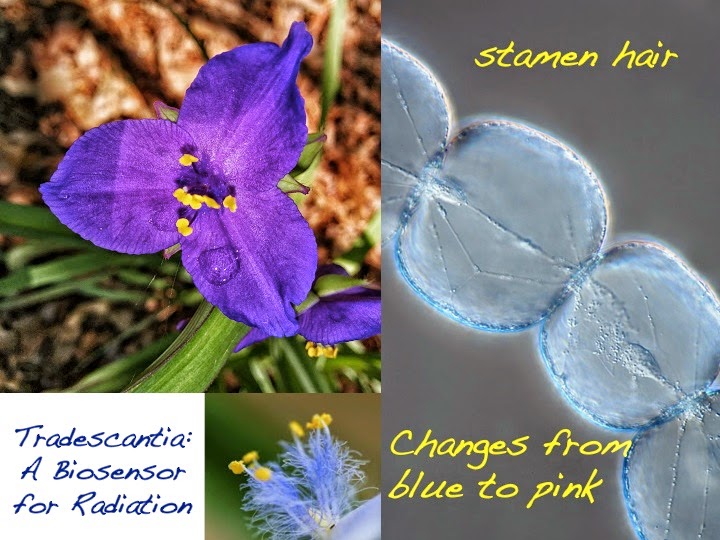 ✿ The stamen hairs of the common spiderwort (Tradescantia) are made up of rows of cells in single file, like beads on a string. Fuzzy and blue, they emerge by the hundreds around the stamens that hold up the bright yellow, pollen-filled anthers in the flower center. In 1975, a scientist named Sparrow made a remarkable discovery: the stamen hairs were highly sensitive to nuclear radiation, mutating from blue to pink like the floral equivalent of the canary in the coal mine! The mutation frequency is linear down to very low doses and low exposure rates such that counting the number of pink cells as a percentage of blue ones gives an accurate reading of radiation exposure. Since the cells divide in sequence, the position of the pink cell tells when the radiation exposure occurred. The flowers have been used to monitor radiation leaks around nuclear plants in Japan or as a biosensor for chemical pollutants (http://goo.gl/GTMi9C).