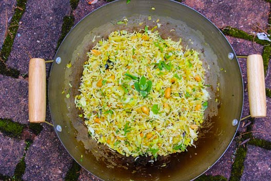 Add to hot oil: black mustard seeds, white split urad dal, yellow split channa dal, roasted peanuts, dash of asafoetida powder, curry leaves, a few grains of fenugreek. When the mustard seeds turn grey and pop, and the dals release a nutty aroma, add the chopped onions and cabbage in succession. I leave green chillies whole so the wimps boys can fish them out. Stir on high heat, season with salt, a pinch of turmeric and your favorite garam masala spice mix. I used one made my mom that I have stashed away in my refrigerator.