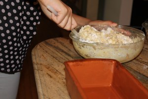 Fold them together, gently. Do not over mix. Pour into an oiled baking pan.